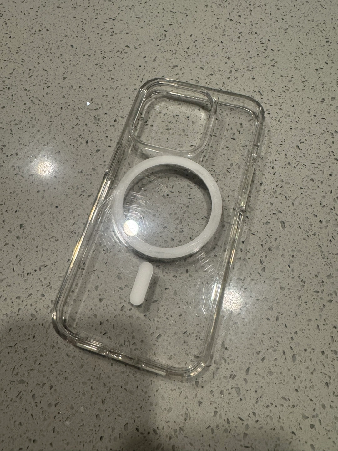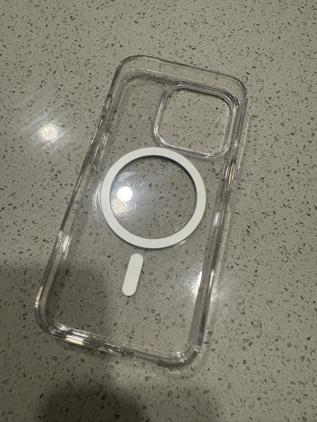 Clear phone case compatible with MagSafe. Designed for iPhone 15 Pro models. Features a built-in MagSafe ring. Provides protection and allows for wireless charging.
