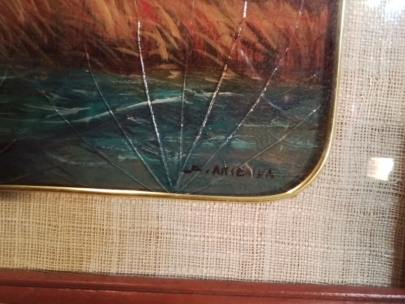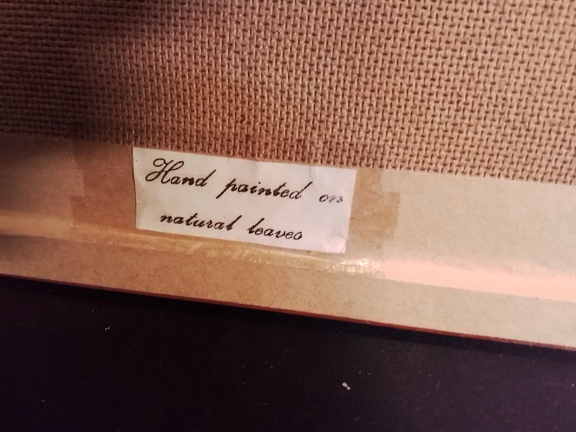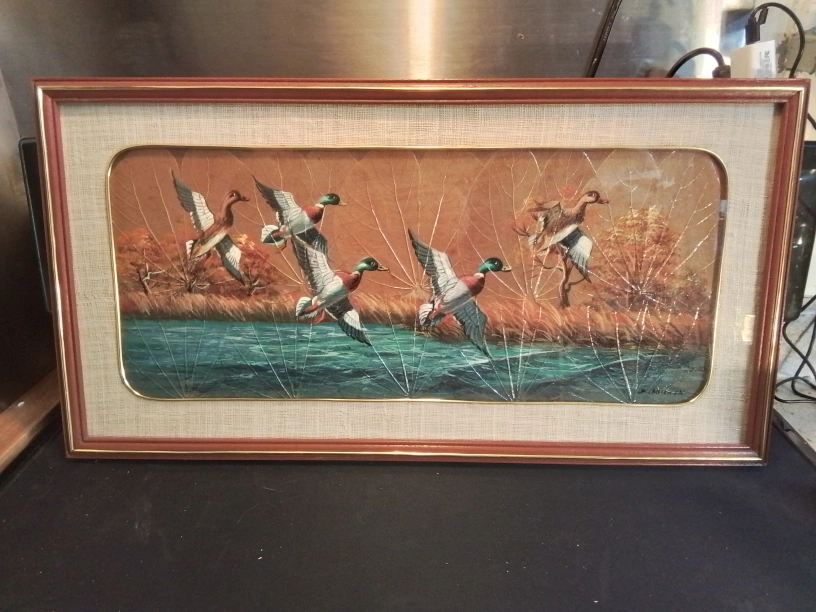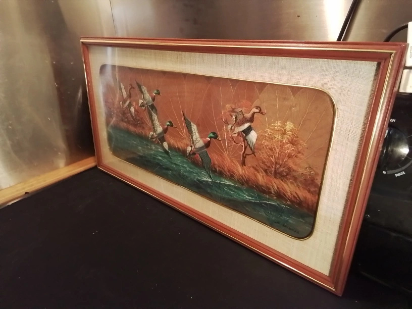 Graceful Mallard' Ducks Alighting Oil Painting On Leaves Artist Signed Vintage Framed Leaf Art Print - Ducks in Flight Beautiful vintage framed artwork. Features a painting of ducks flying over water. Created using pressed leaves. Wooden frame with gold inner border. Artist signature visible. Condition Excellent Measurements: 25.5" x 13.5" Pickup at Young Street and Steels Ave