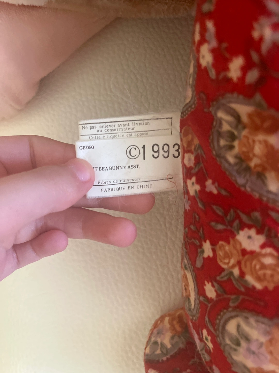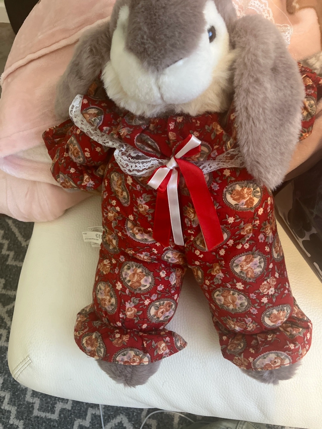 Adorable vintage stuffed bunny. Grey fur, wearing red floral pyjamas. Lace accents. This is a vintage plushie from a band called Terry nova from my knowledge they don’t sell this brand anymore so it’s a unique plushie