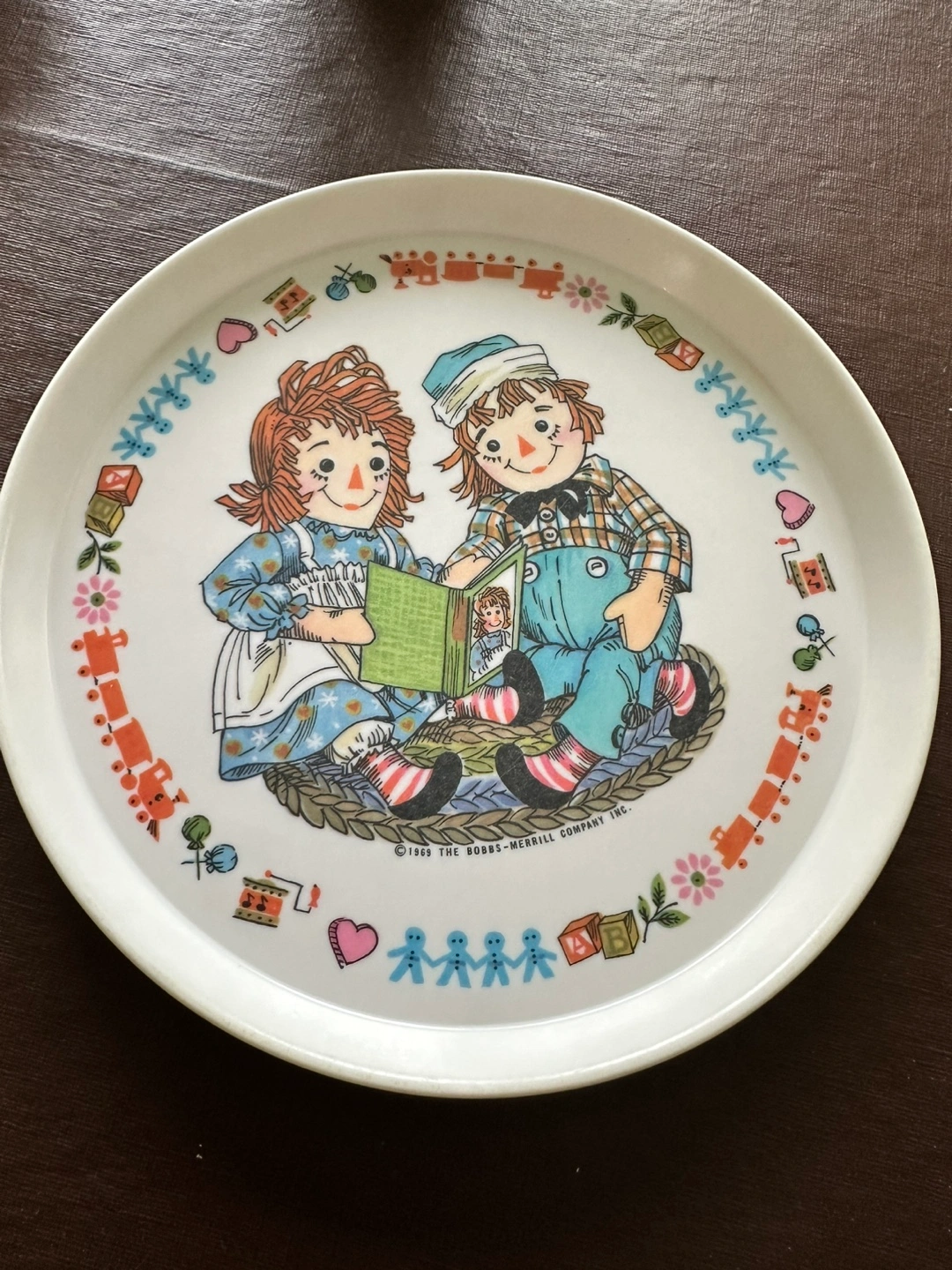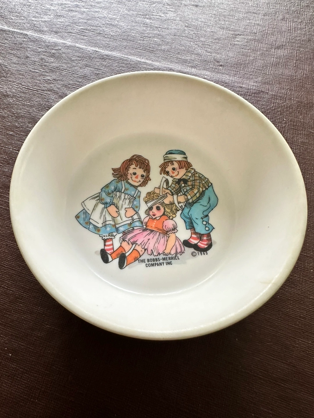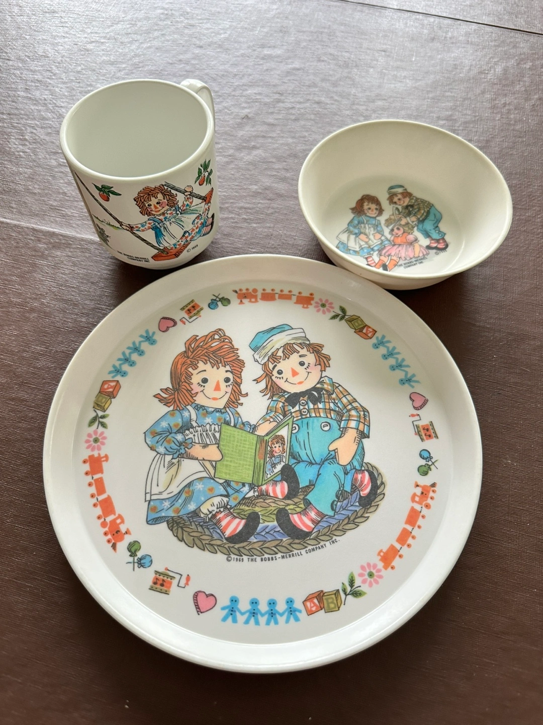Adorable vintage children's dish set. Features Raggedy Ann and Andy. Includes a plate, bowl, and mug. Raggedy Ann & Andy melamine child’s set: cereal bowl #3358 plate #3101 mug #4309 7 Slight discolouration on the bowl (well used). Vintage 1969 Oneida Bobbs- Merrill Company 3 Pieces. Great for collectors or for use.