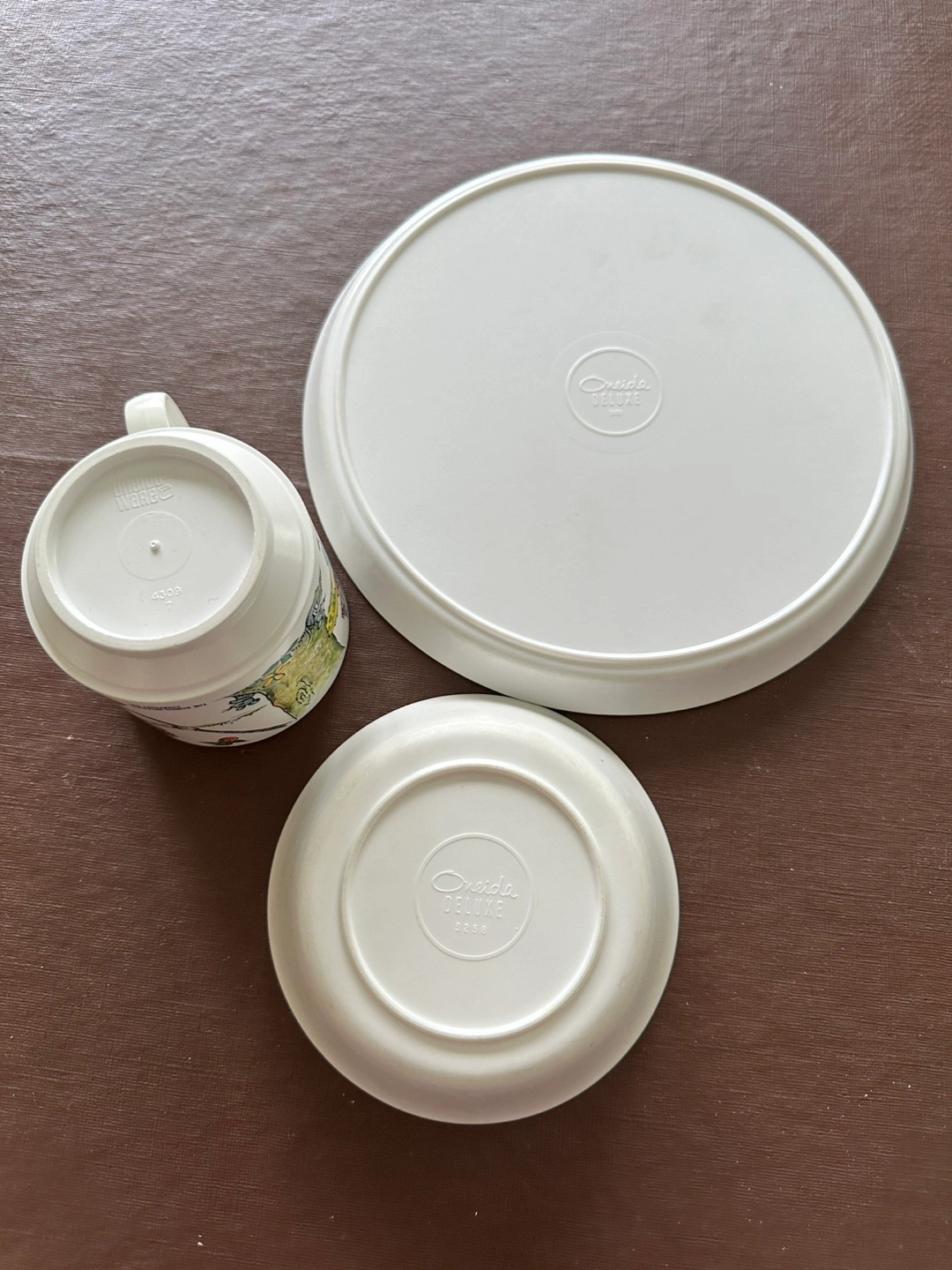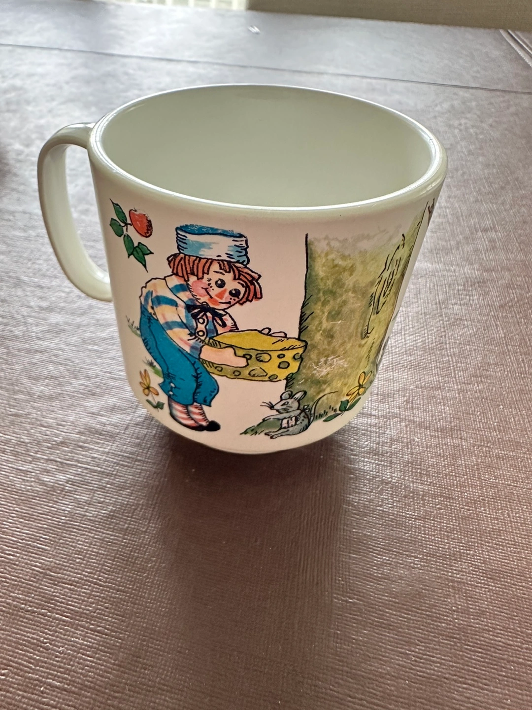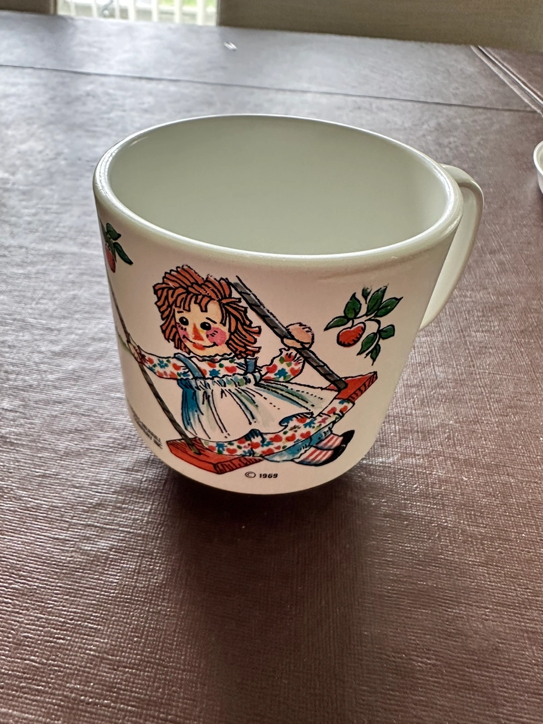 Adorable vintage children's dish set. Features Raggedy Ann and Andy. Includes a plate, bowl, and mug. Raggedy Ann & Andy melamine child’s set: cereal bowl #3358 plate #3101 mug #4309 7 Slight discolouration on the bowl (well used). Vintage 1969 Oneida Bobbs- Merrill Company 3 Pieces. Great for collectors or for use.