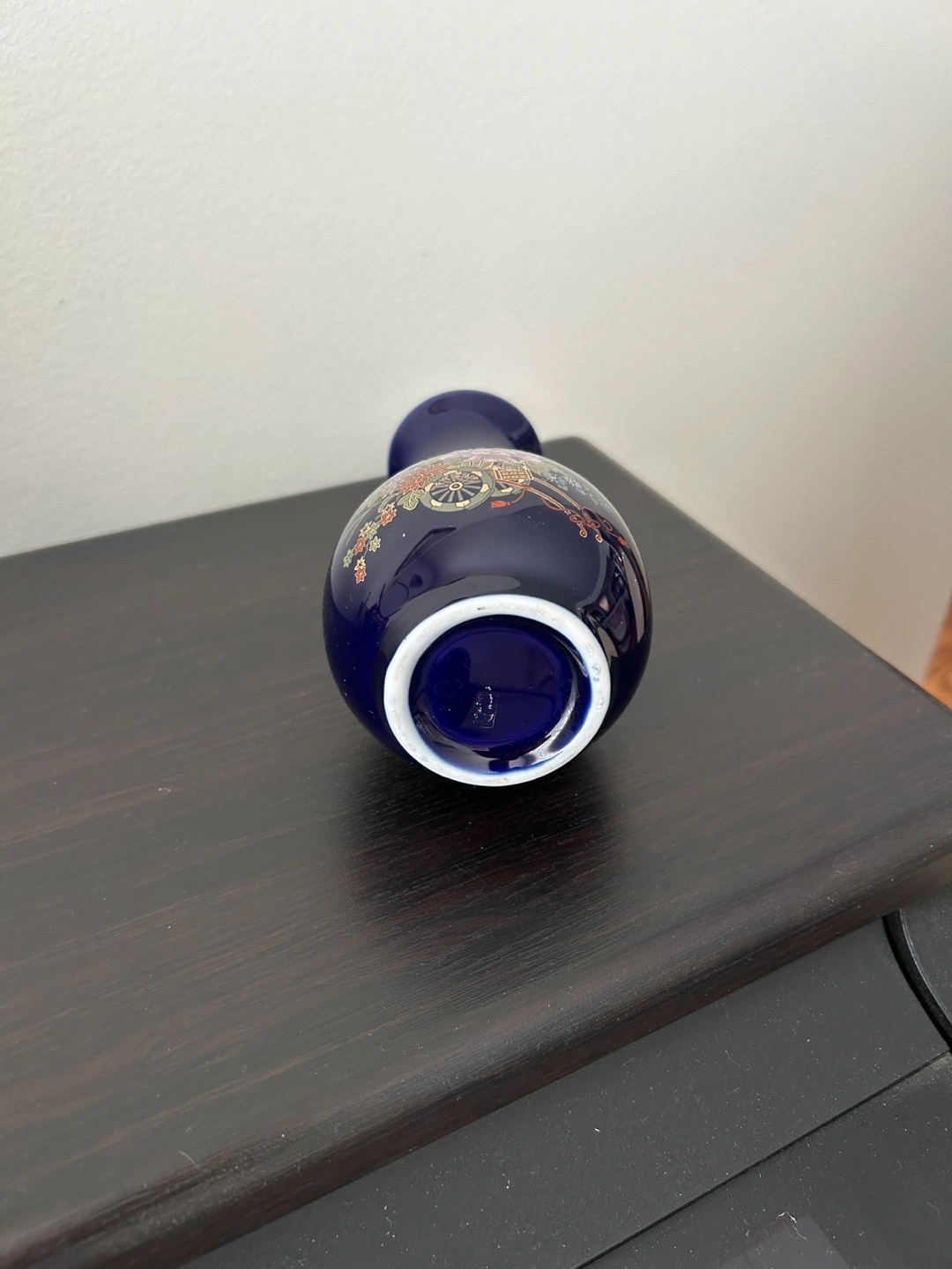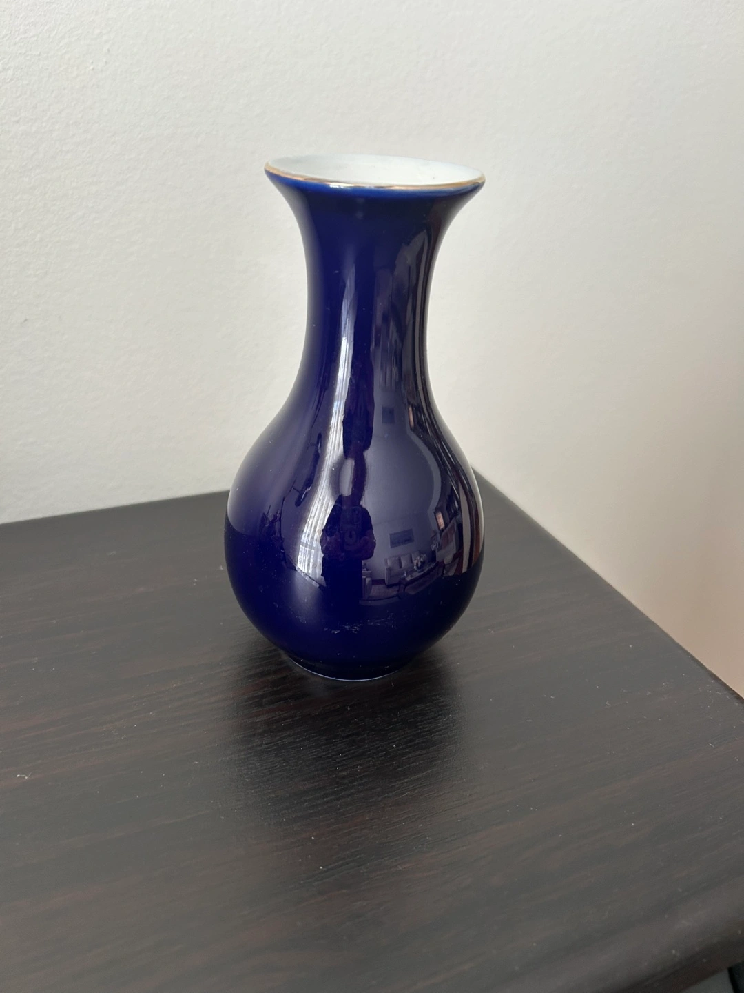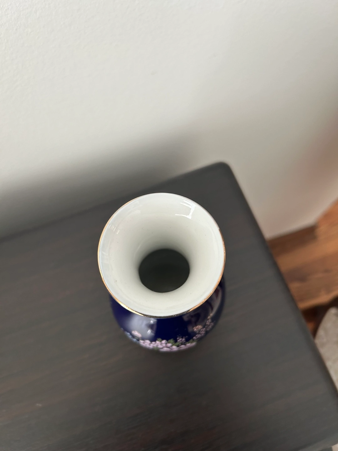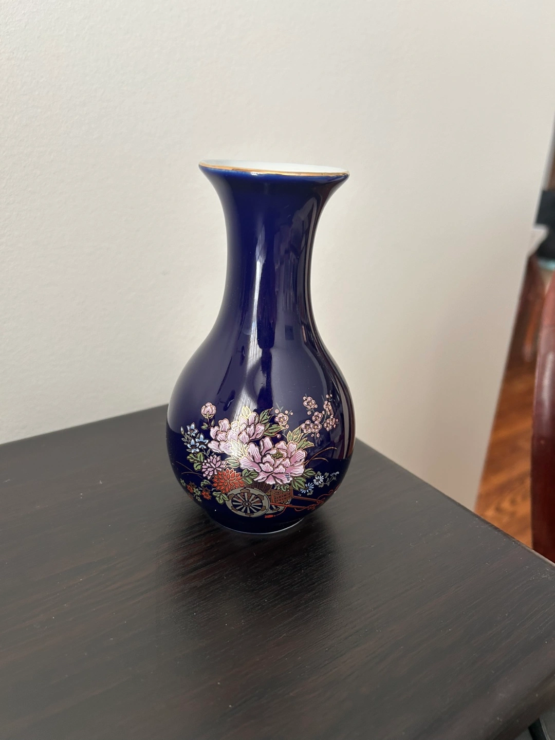 Small cobalt blue porcelain vase. Features a floral design and gold accents. Elegant and decorative. Perfect for a small bouquet or as a decorative accent.