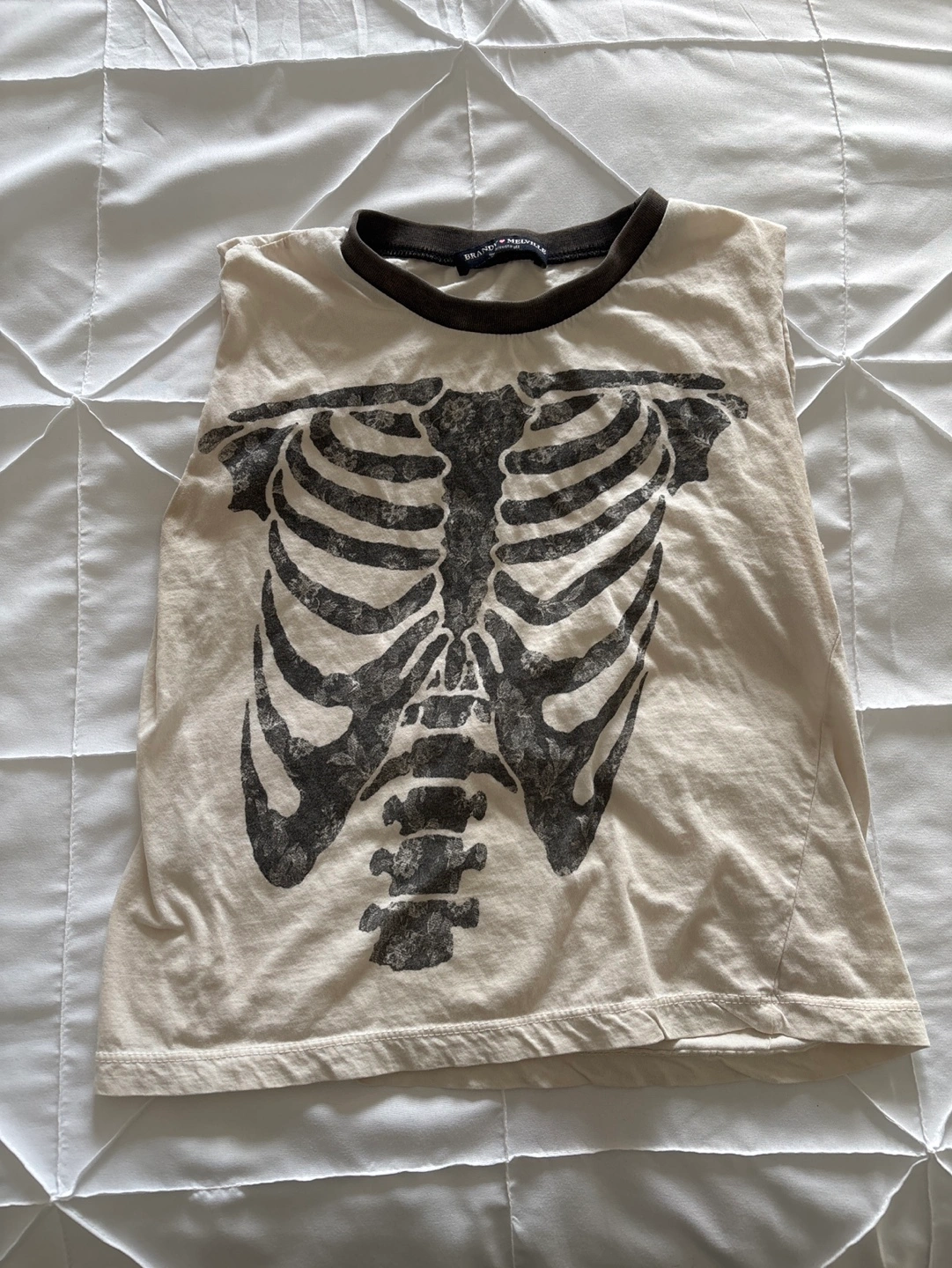 Brandy Melville sleeveless top. Features a skeleton graphic on an off-white background. Dark grey ribbed neckline. Casual style.