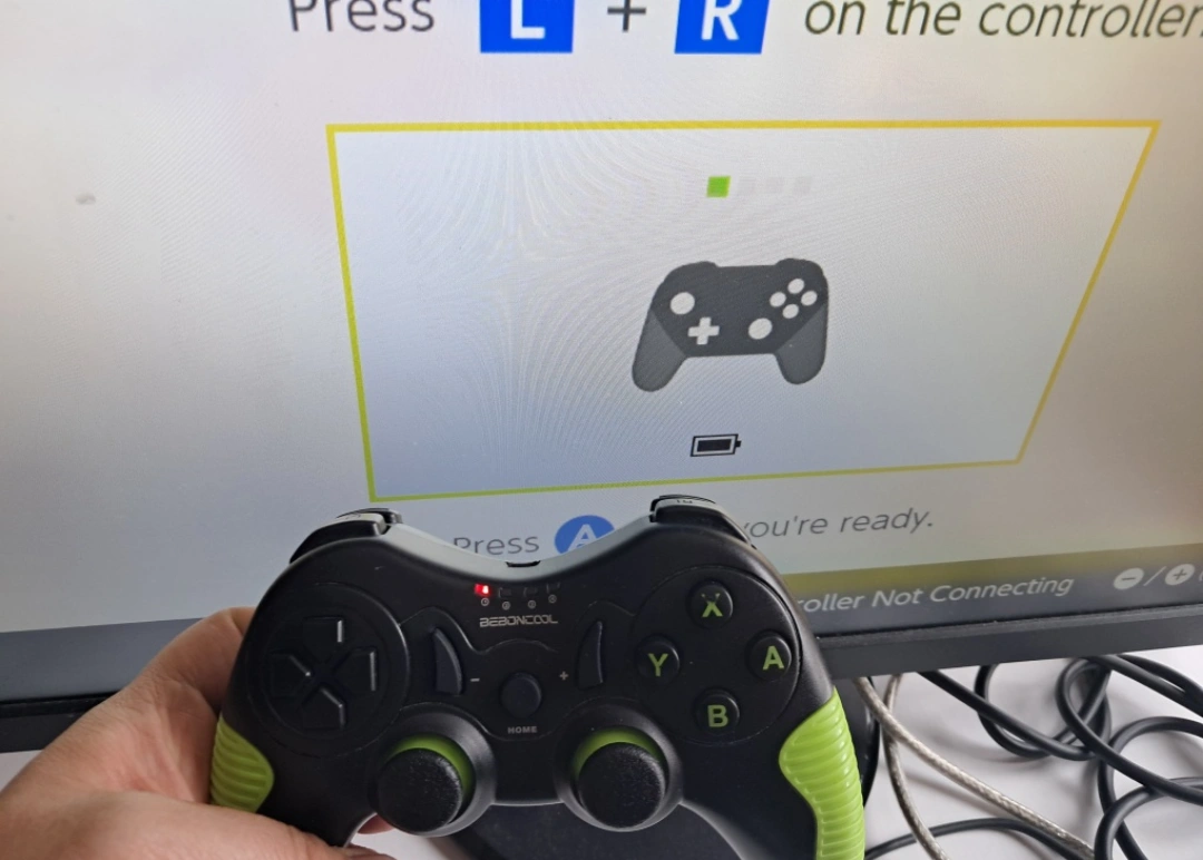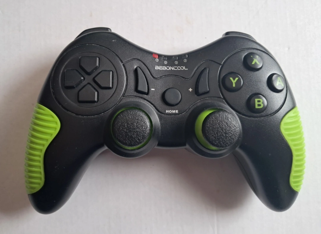 Wireless game controller. Black and lime green. Features multiple buttons and joysticks. Compatible with Nintendo switch Uses micro to charge the controller