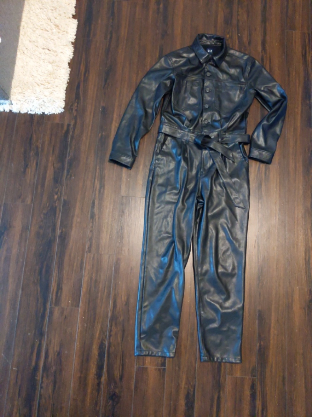 Gorgeous black vegan/faux leather jumpsuit. tags removed, tried in and never worn. size 4, but fits big, more like a 6. super warm and flattering. straight leg, removable belt. buttery! purchased for $95 pickup downtown near OCAD on McCaul st tags women ladies teens black jumpsuit utility leather pleather faux vegan gap style warm work outfit