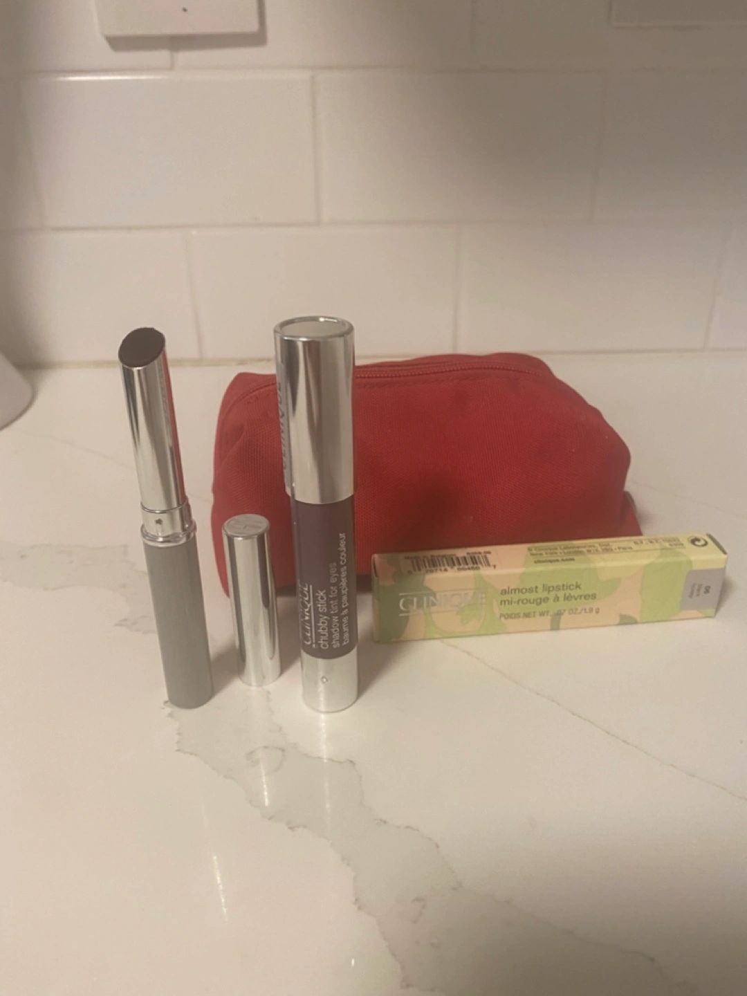 Clinique makeup set. Includes almost lipstick, chubby stick for eyes, and a small travel case.