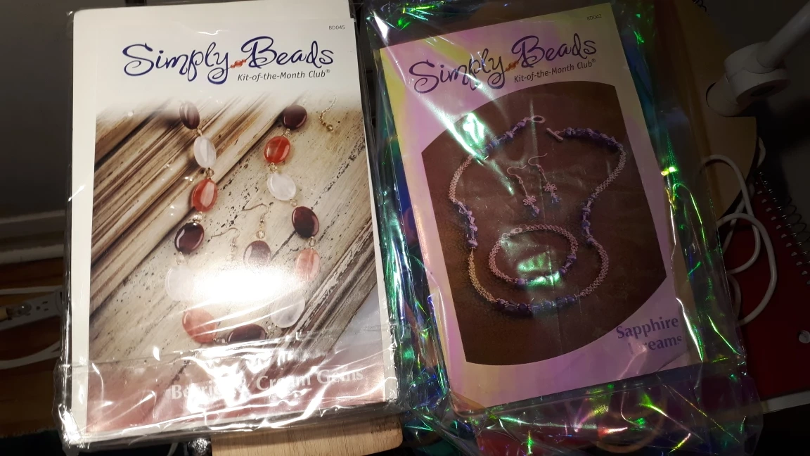 Two unopened Simply Beads Kit-of-the-Month Club kits. One kit features Sapphire Dreams, the other Berries & Cream Gems. Each kit contains beads, findings, and instructions for creating jewellery. Perfect for jewellery makers.
