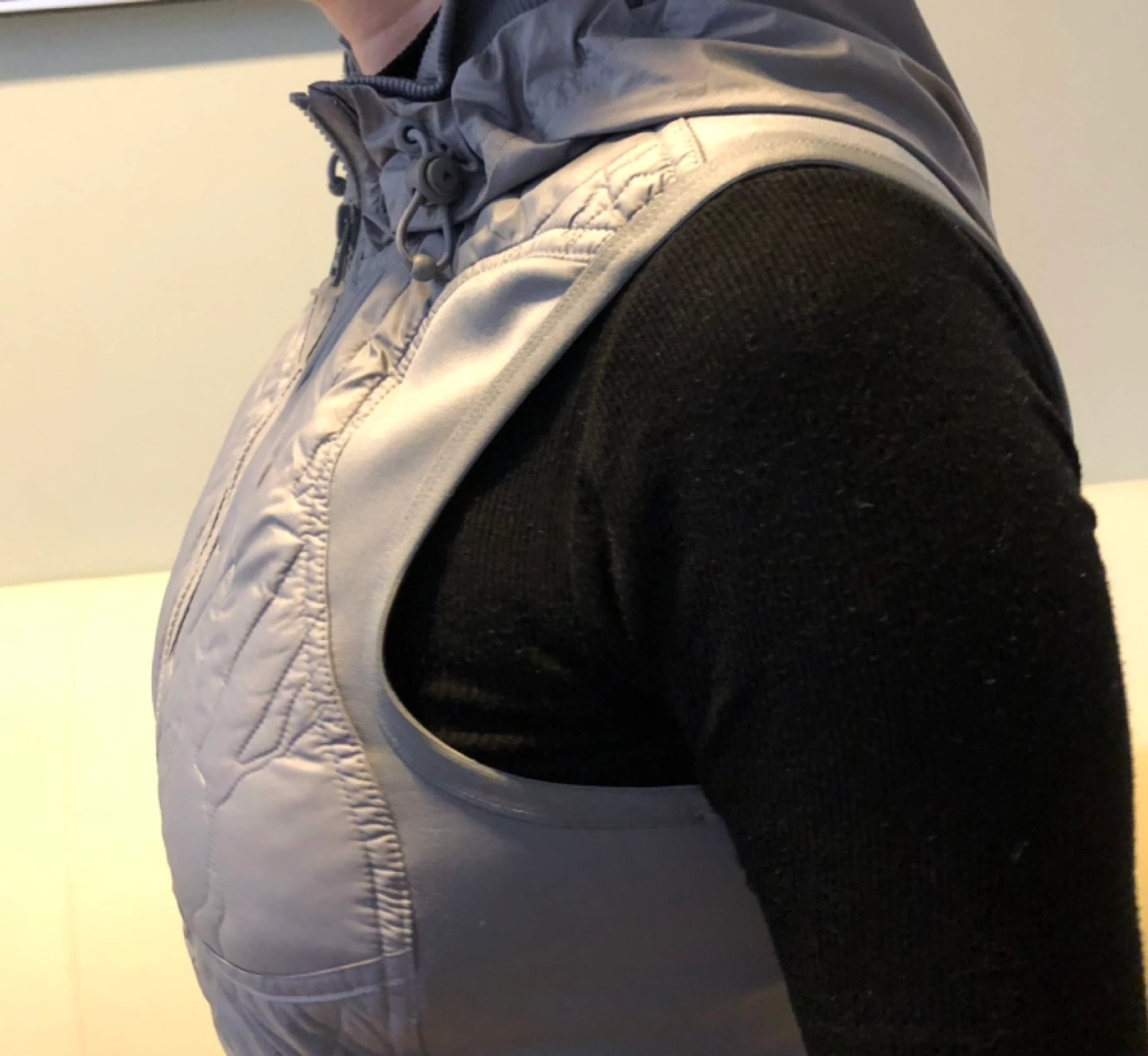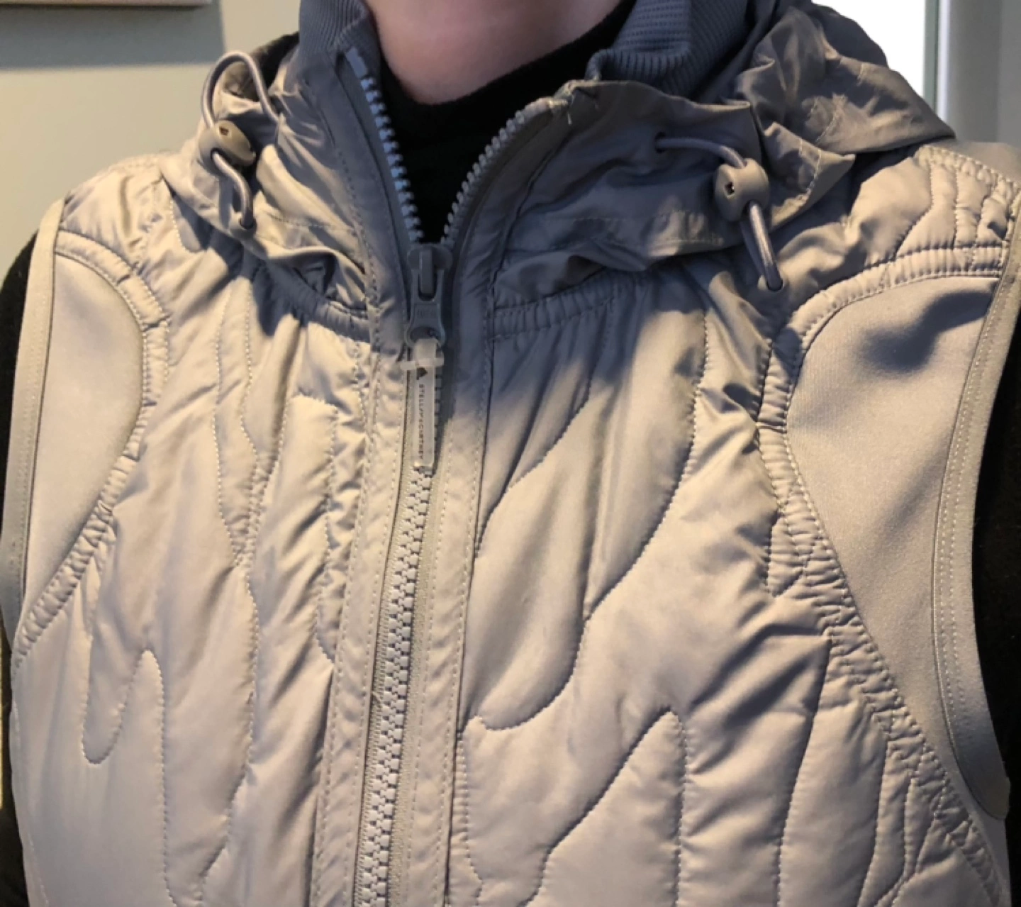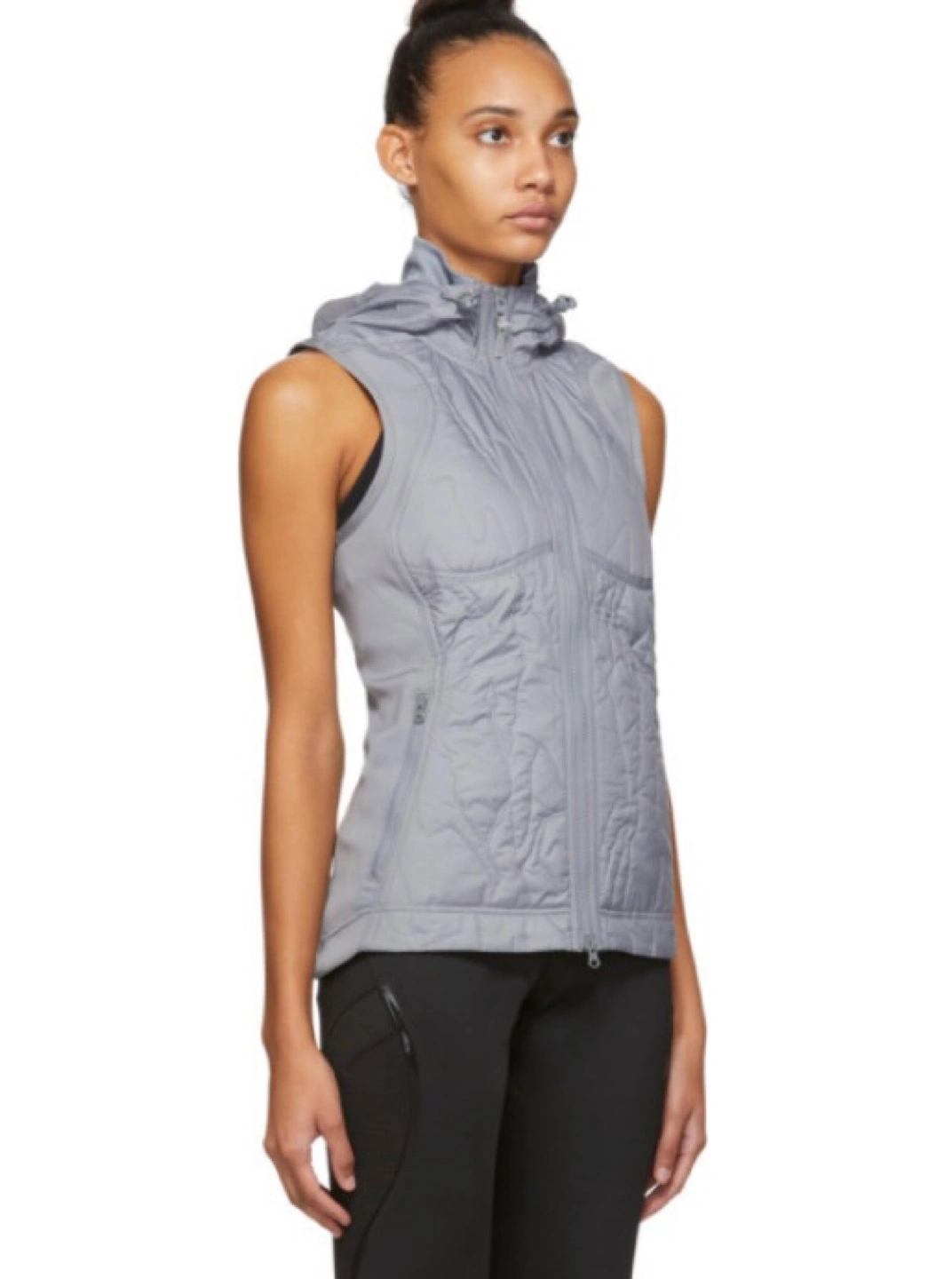 Sleeveless insulated quilted taffeta and stretch technical jersey athletic vest. Grey colour. Bungee-style drawstring and mock rib knit neck at hood. 2-way zip closure at front. Zippered pockets at waist. Zippered pocket and reflective silver tone bonded logo on back. Tonal hardware. Lightweight and comfortable; very flattering fit. Retails for $160; sold out online