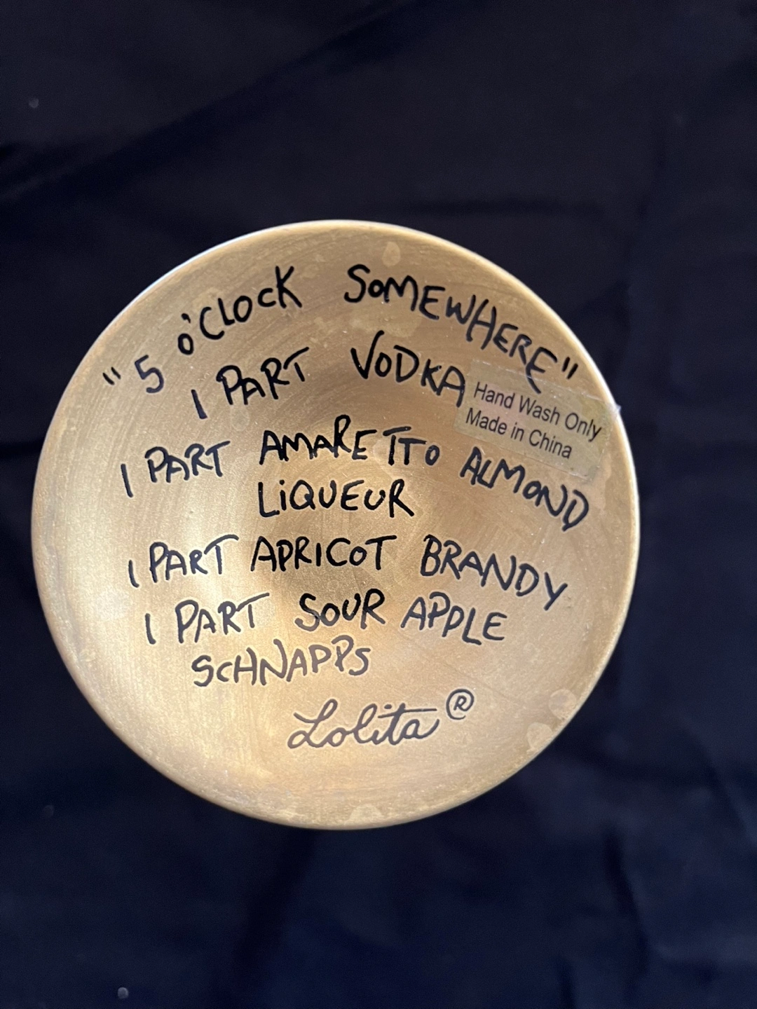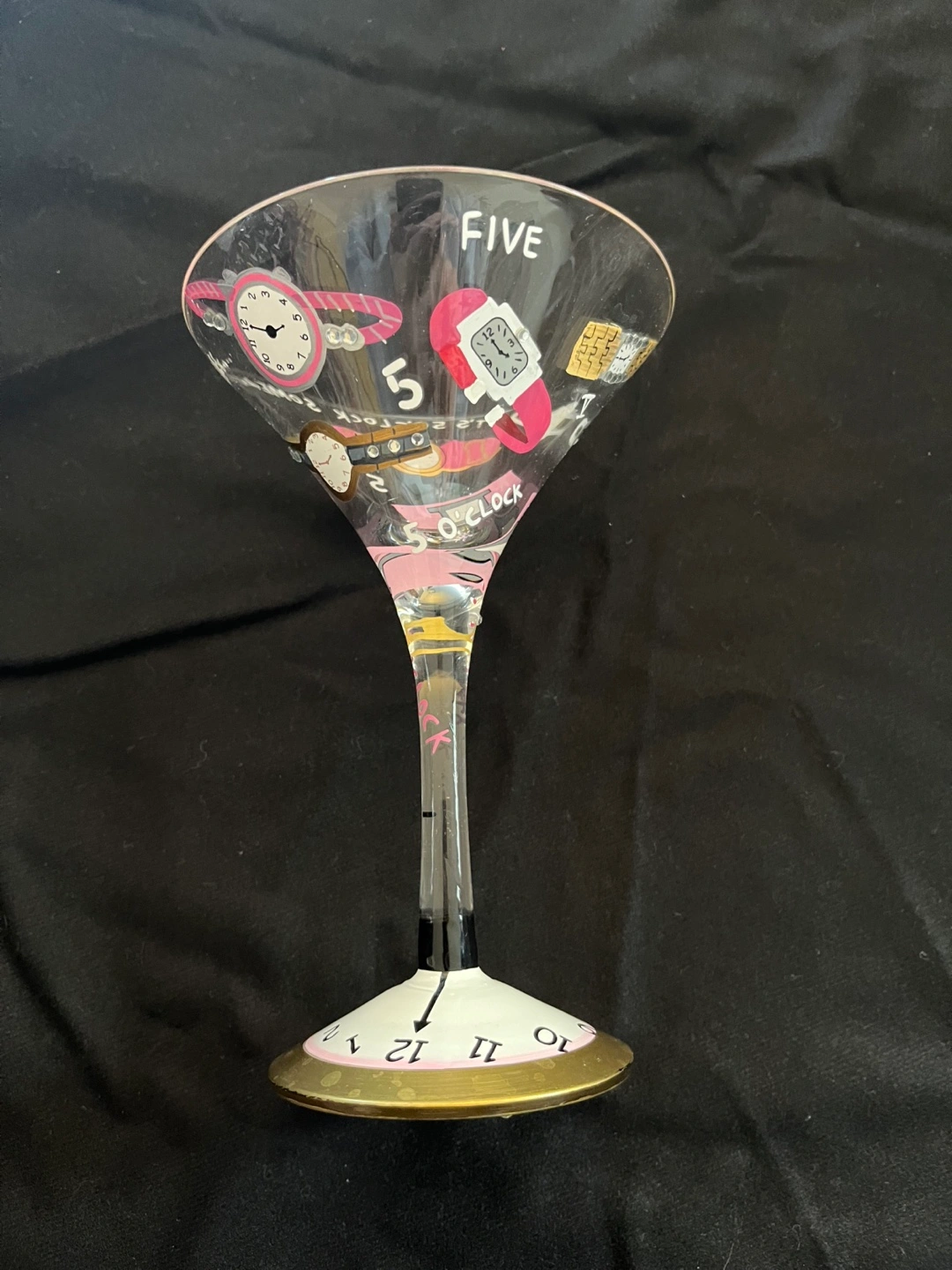 Hand-painted martini glass. Features various clocks and watches. 7 oz capacity. Cocktail recipe on bottom. Made in China.