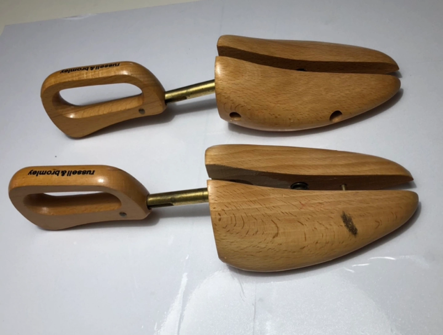 Pair of vintage Russell & Bromley shoe trees. Wooden construction, brass accents. Large size. Made in England.