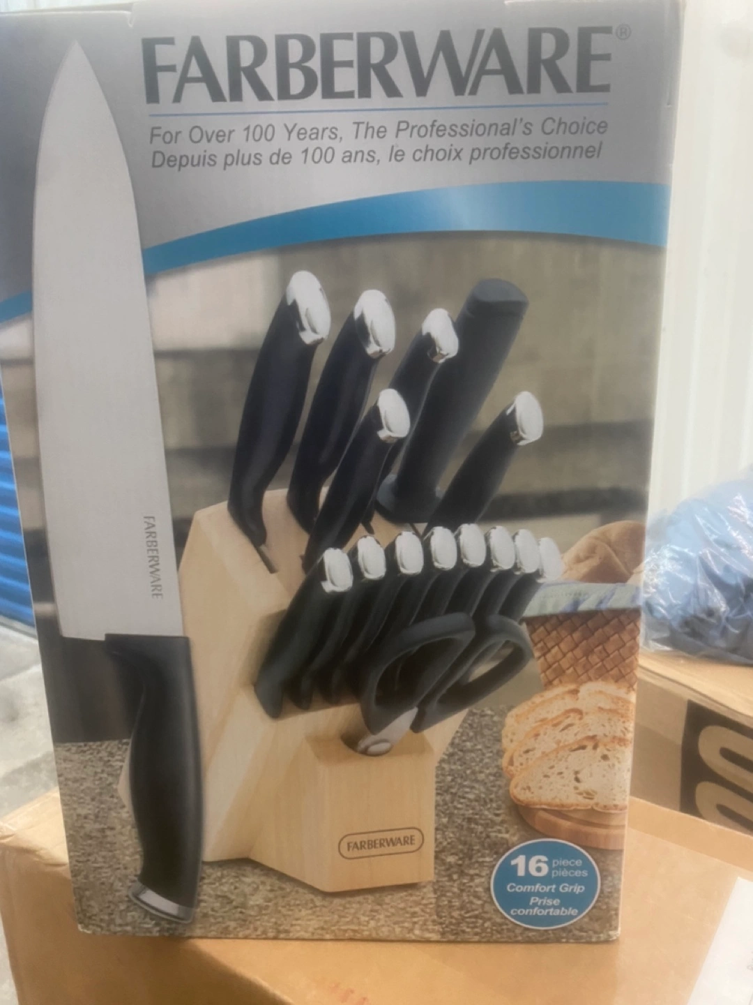 New Farberware knife set. Includes 16 pieces. Wooden block included. Comfort grip handles.