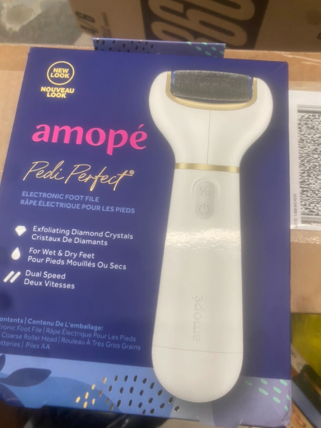 Electronic foot file. Exfoliating diamond crystals. For wet and dry feet. Dual speed. New look packaging.