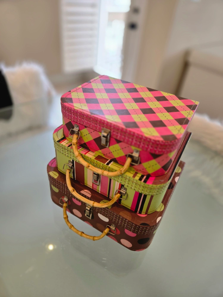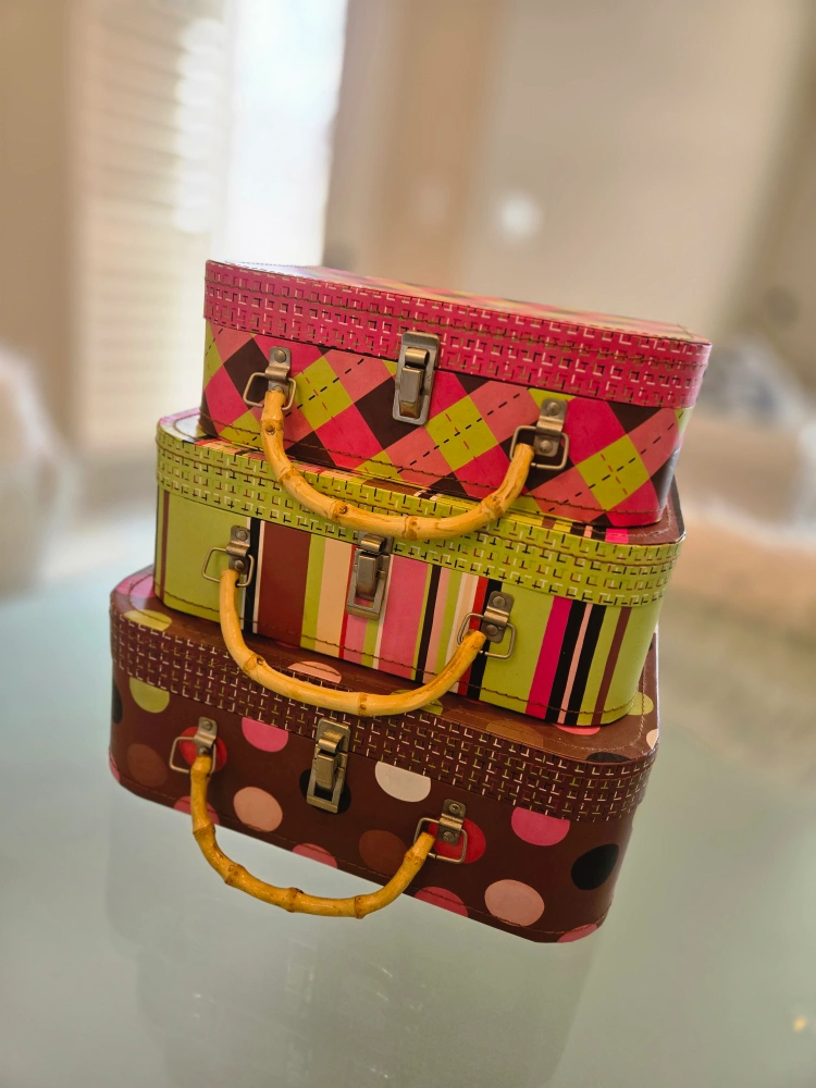Three miniature suitcases. Stacked, colourful patterns. Bamboo handles. Ideal for storage or decoration.