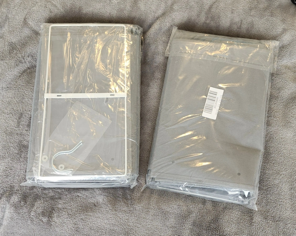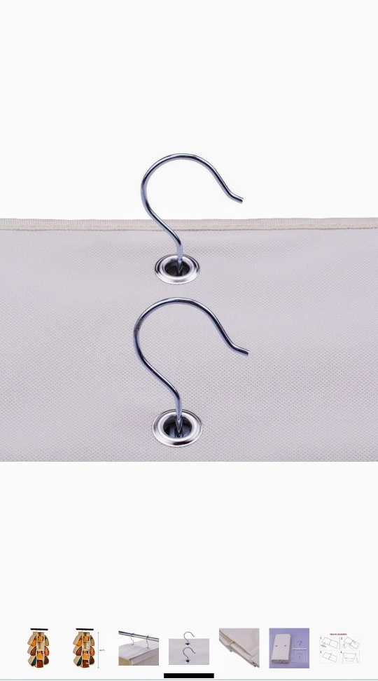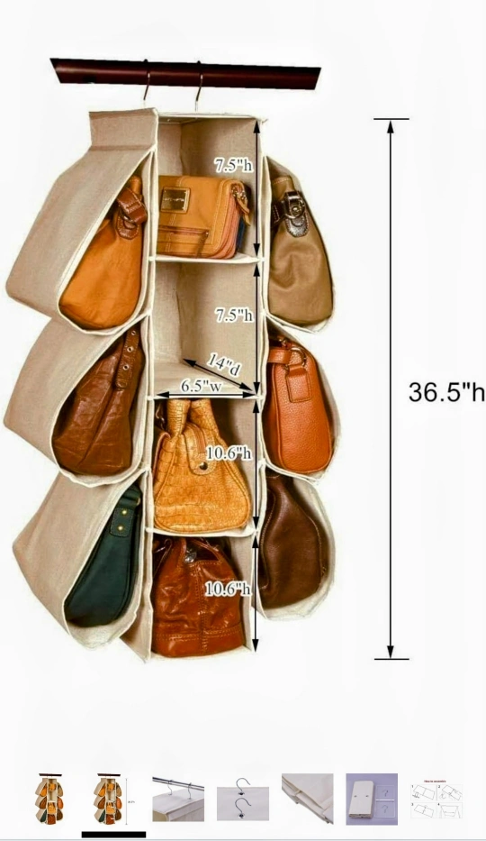 Grey fabric hanging organiser. Multiple compartments for handbags. Hangs from a closet rod. Includes metal hooks.