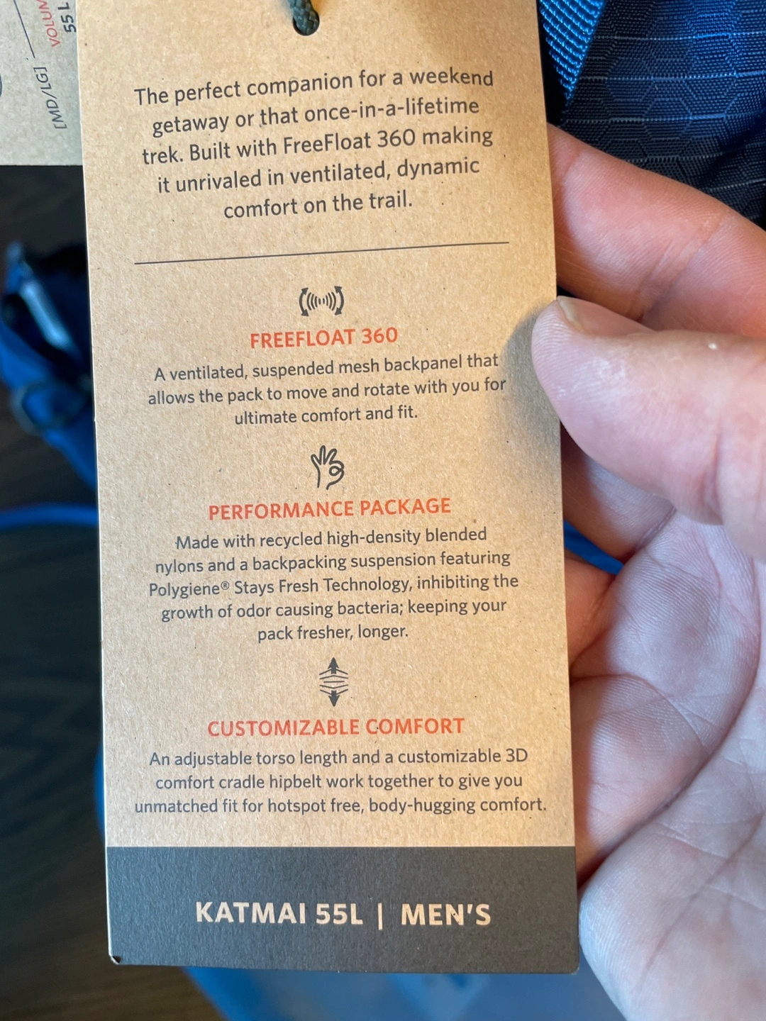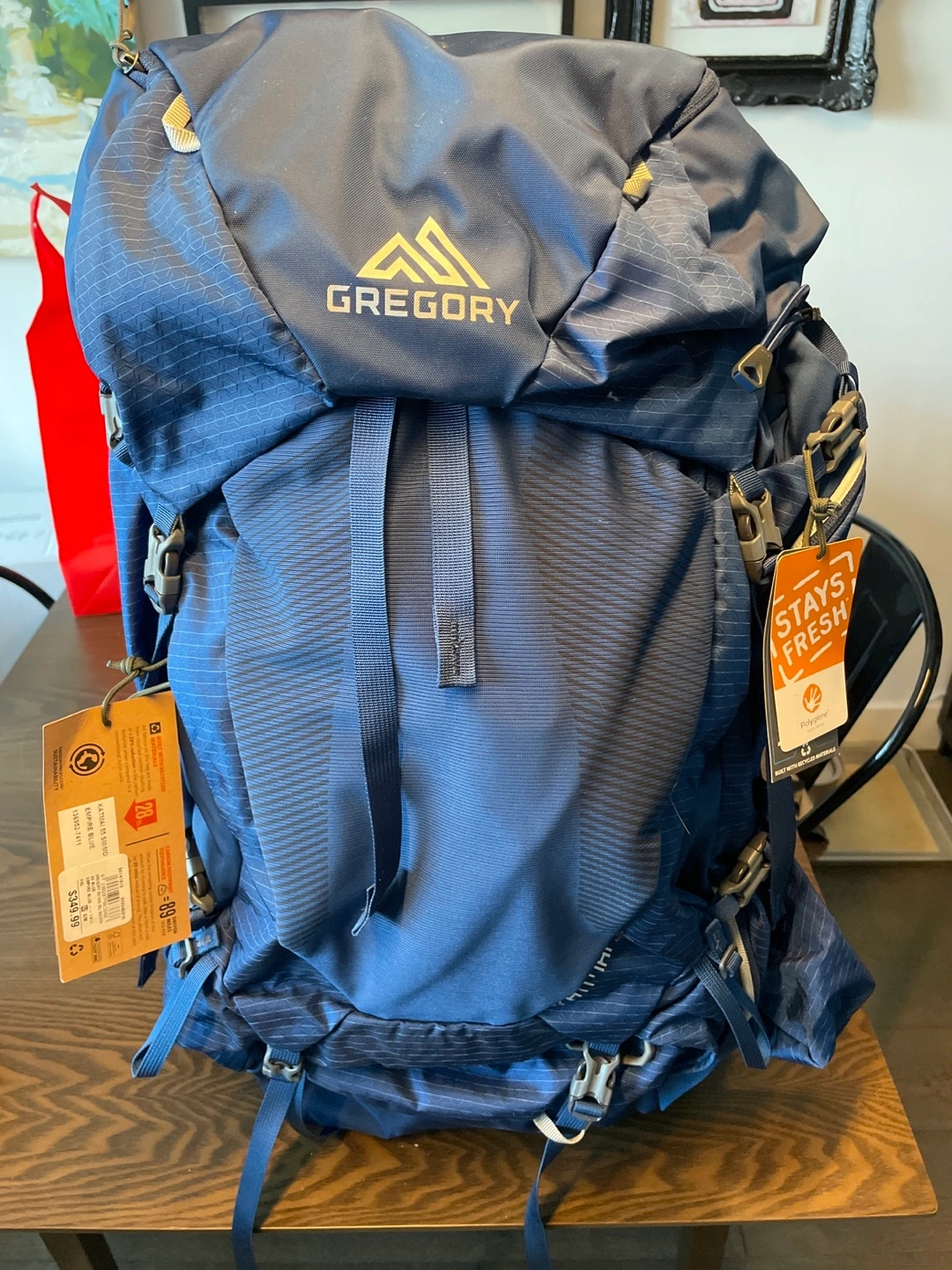 Brand new and never used Gregory Katmai 55 litre backpack. Features adjustable straps and multiple compartments. So many straps. So many compartments. (Seriously, this is top tier kit) Tags still on it. Top rated thru-hiking backpack. Comes with a Gregory 2 litre water bladder and MEC water proof rain cover. Bought with intention of Bruce Trail and Camino hikes and then life went and got in the way. Price is more than fair for brand new (originally over 450 with bladder and cover)