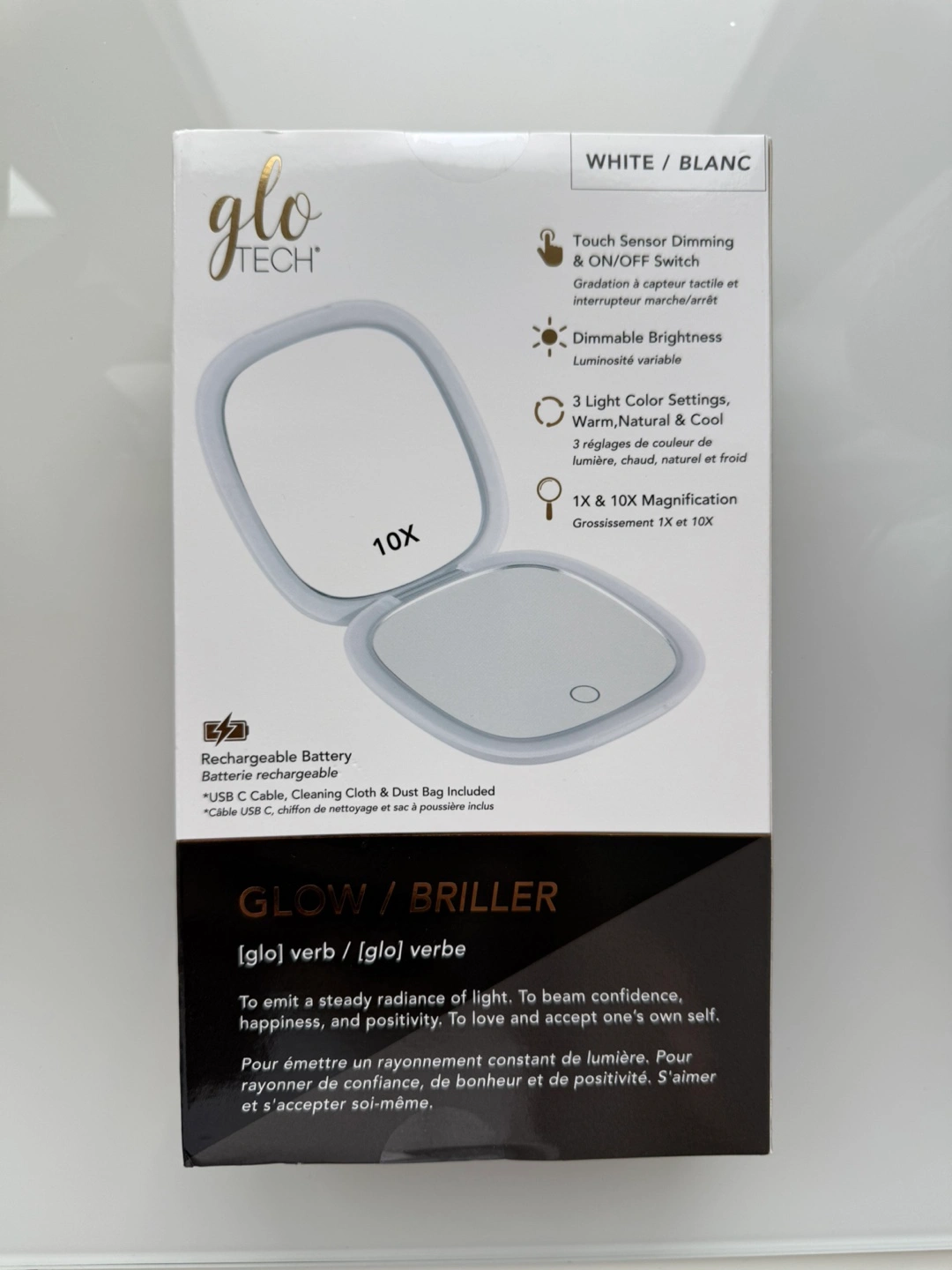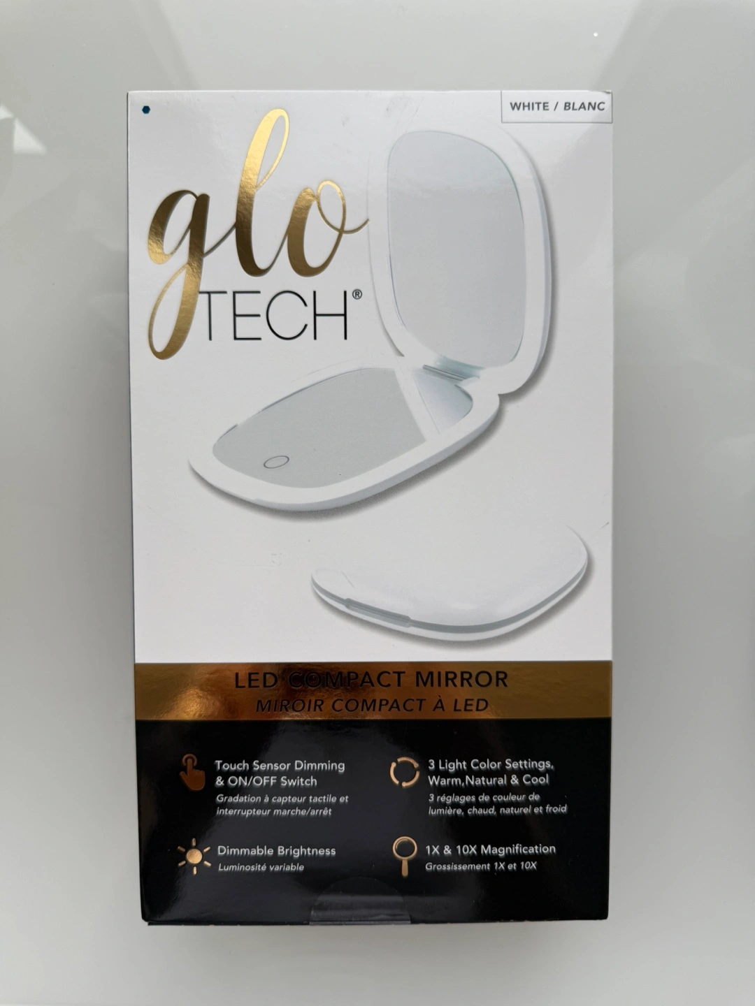 New in box. LED compact mirror. Touch sensor dimming & on/off switch. Three light colour settings: warm, natural & cool. Dimmable brightness. 1x & 10x magnification. Includes cleaning cloth and dust bag.