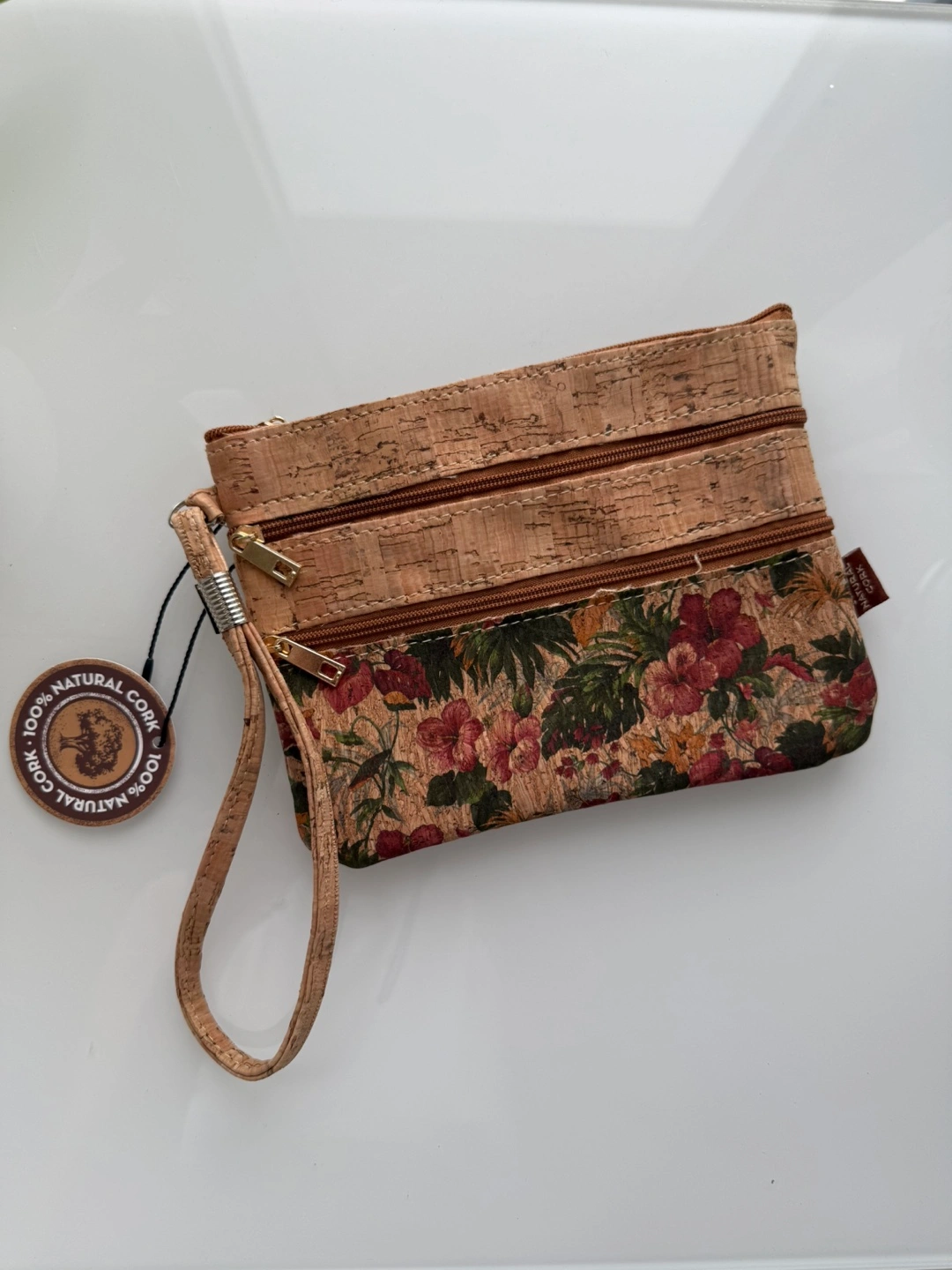 Adorable floral print cork clutch. Features three zippered compartments. Lightweight and durable. Perfect for everyday use.