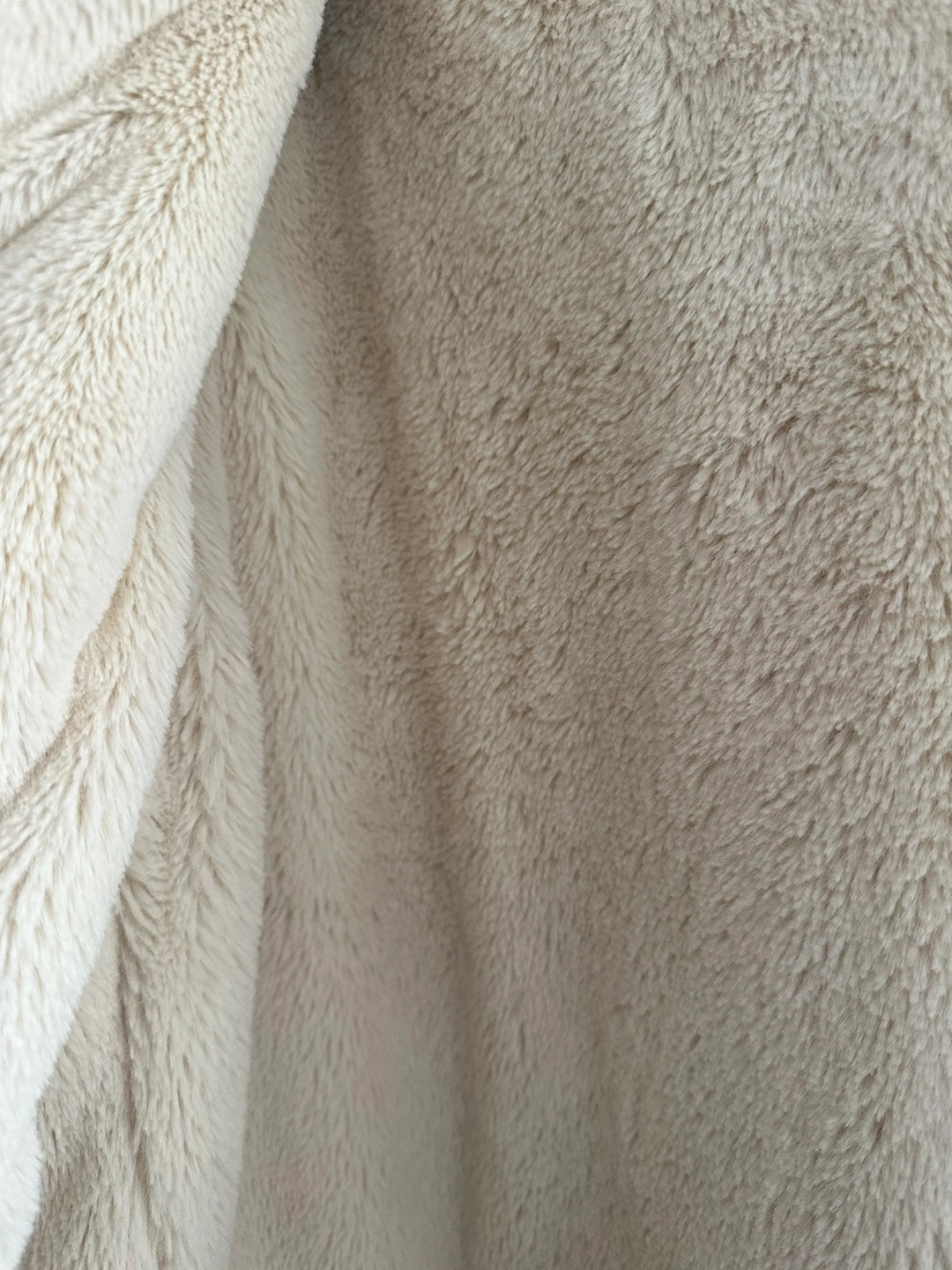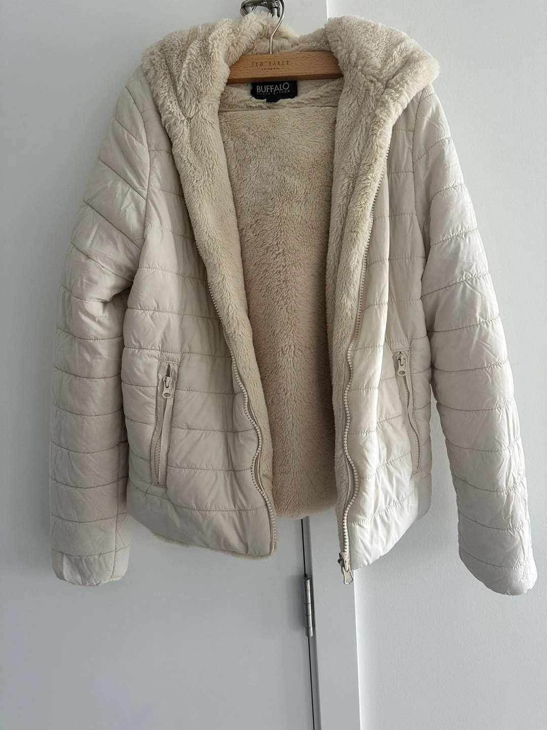 Cream coloured puffer jacket. Features a sherpa lined hood. Zip up front. Side pockets. Small size.