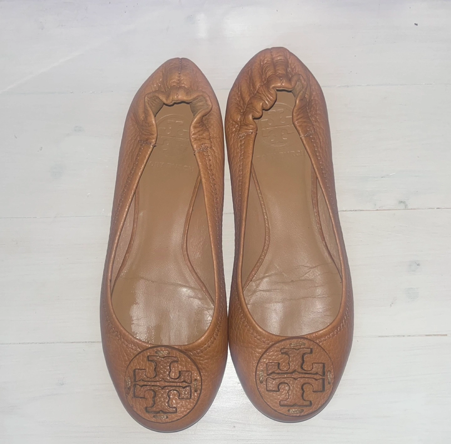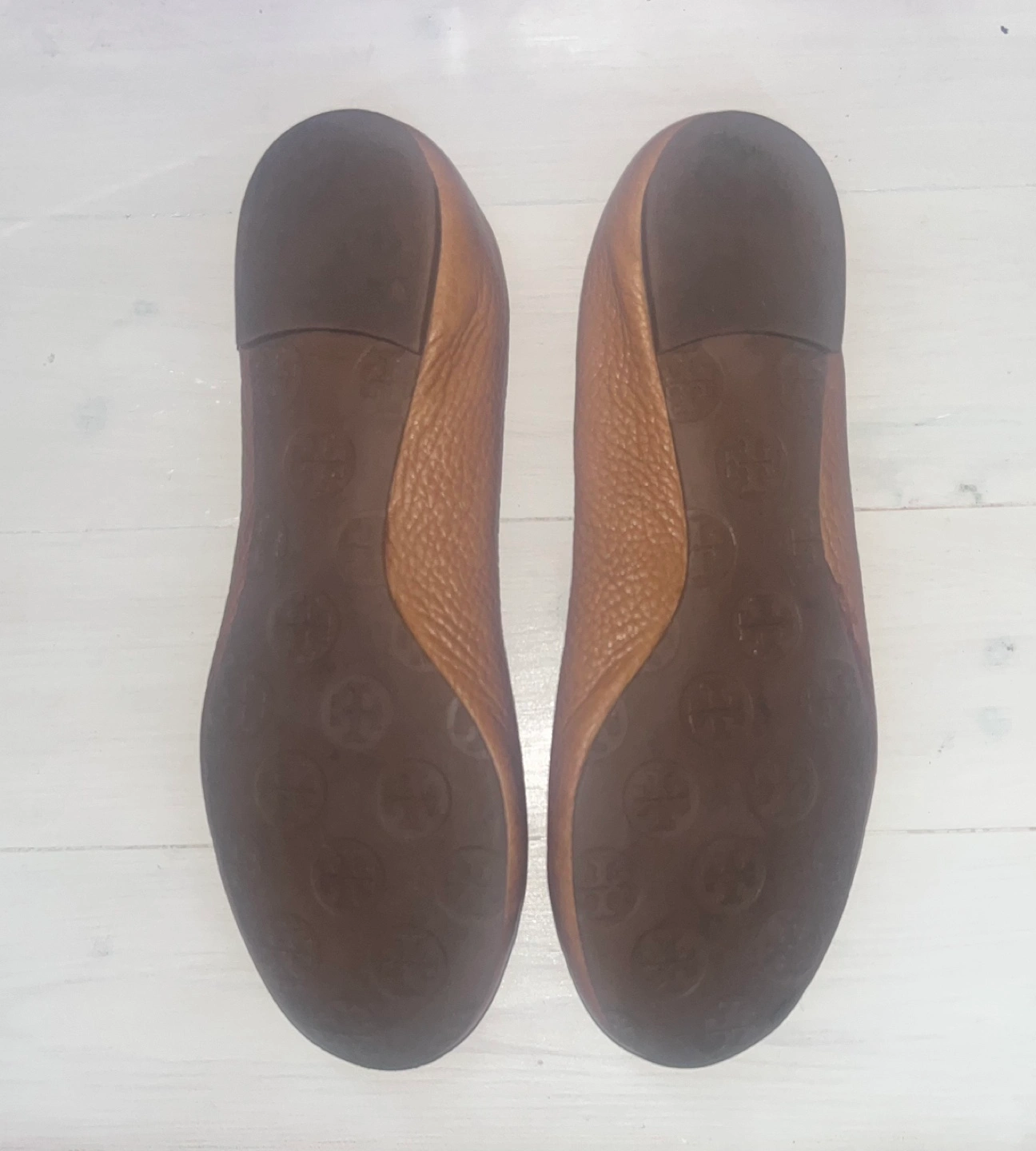 Tan leather ballet flats. Excellent condition. Size 6. Genuine leather upper. Subtle wear.