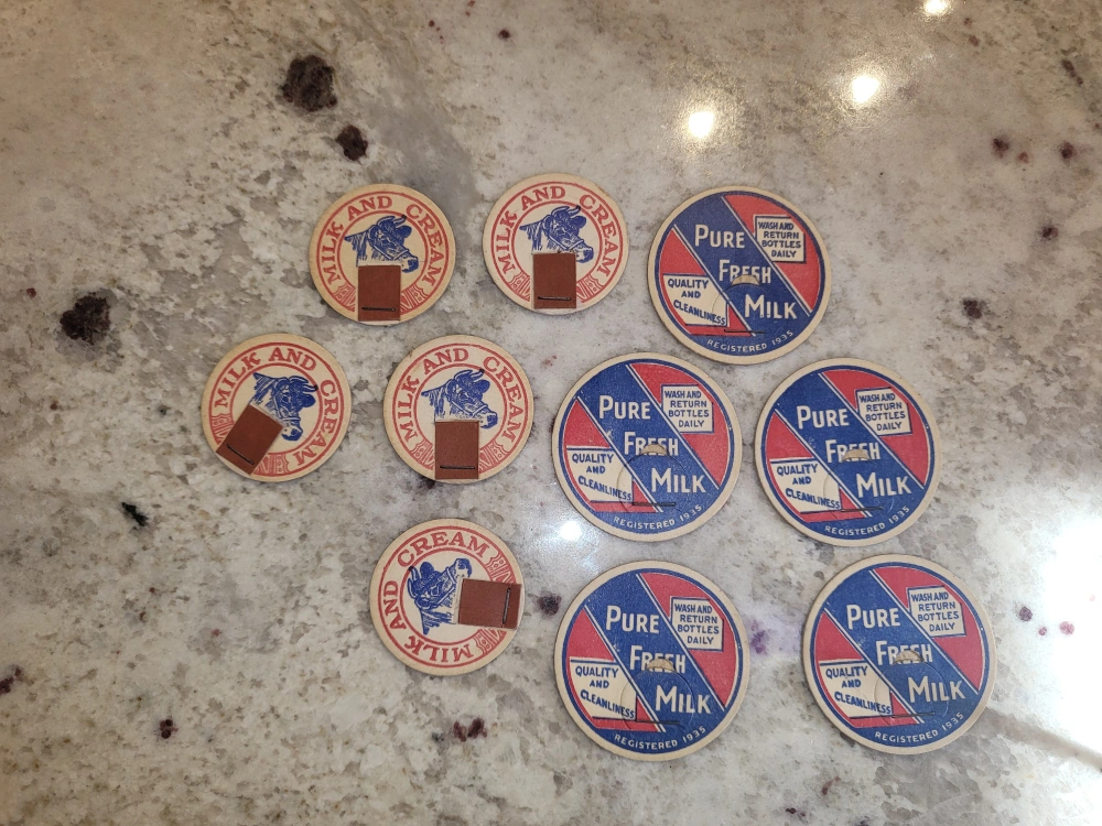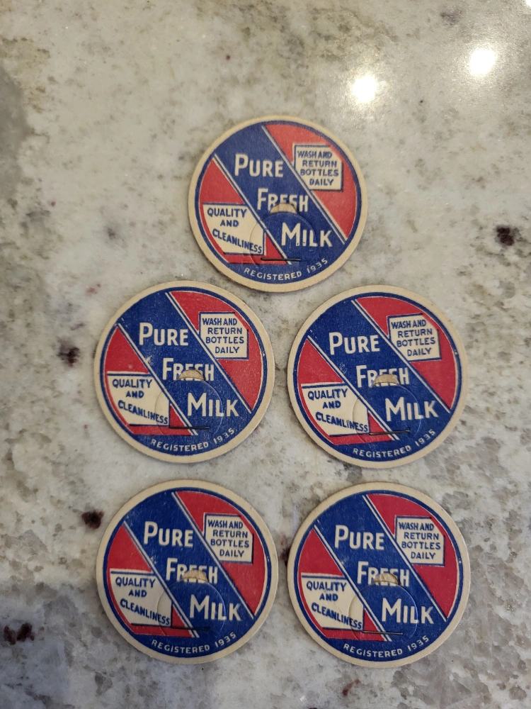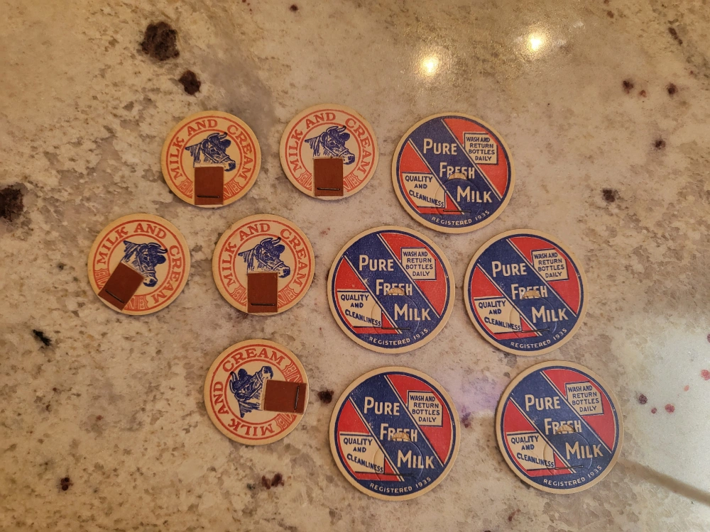 Twelve vintage milk bottle caps. Various designs. Registered 1935. Great for collectors. Five Milk Bottle Caps From 1935. Pure Fresh Milk. Five Milk Bottle Caps Milk and Cream. $40 obo for all.