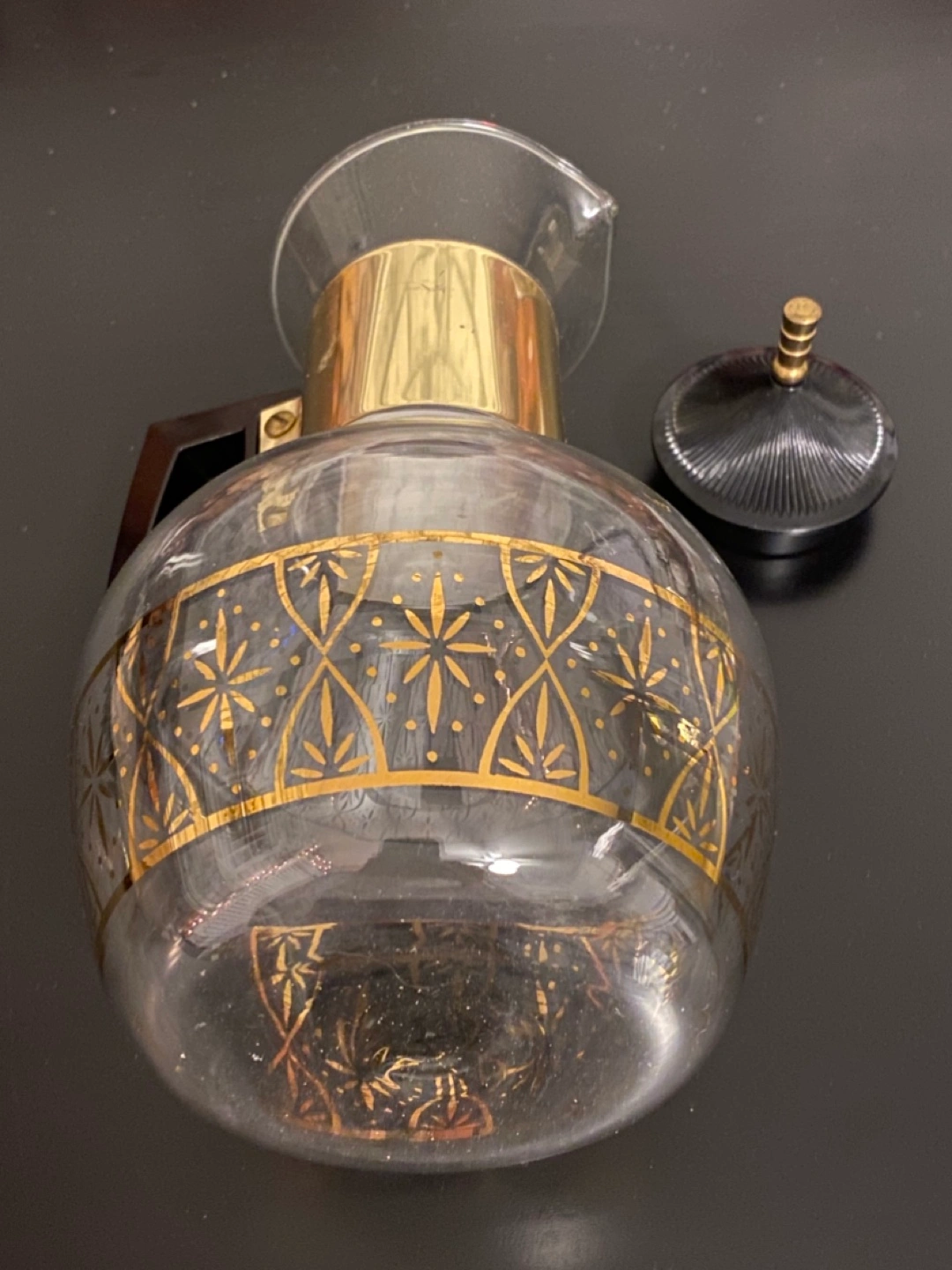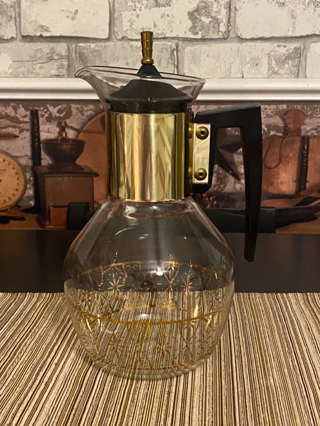 Mid-century modern glass coffee server. 1960’s Features a gold-toned band and decorative gold toned pattern. Unique lid design. Measures 10” in height. No chips or cracks! Excellent Condition! Cash and pick up only, Cawthra and Lakeshore area in Mississauga.
