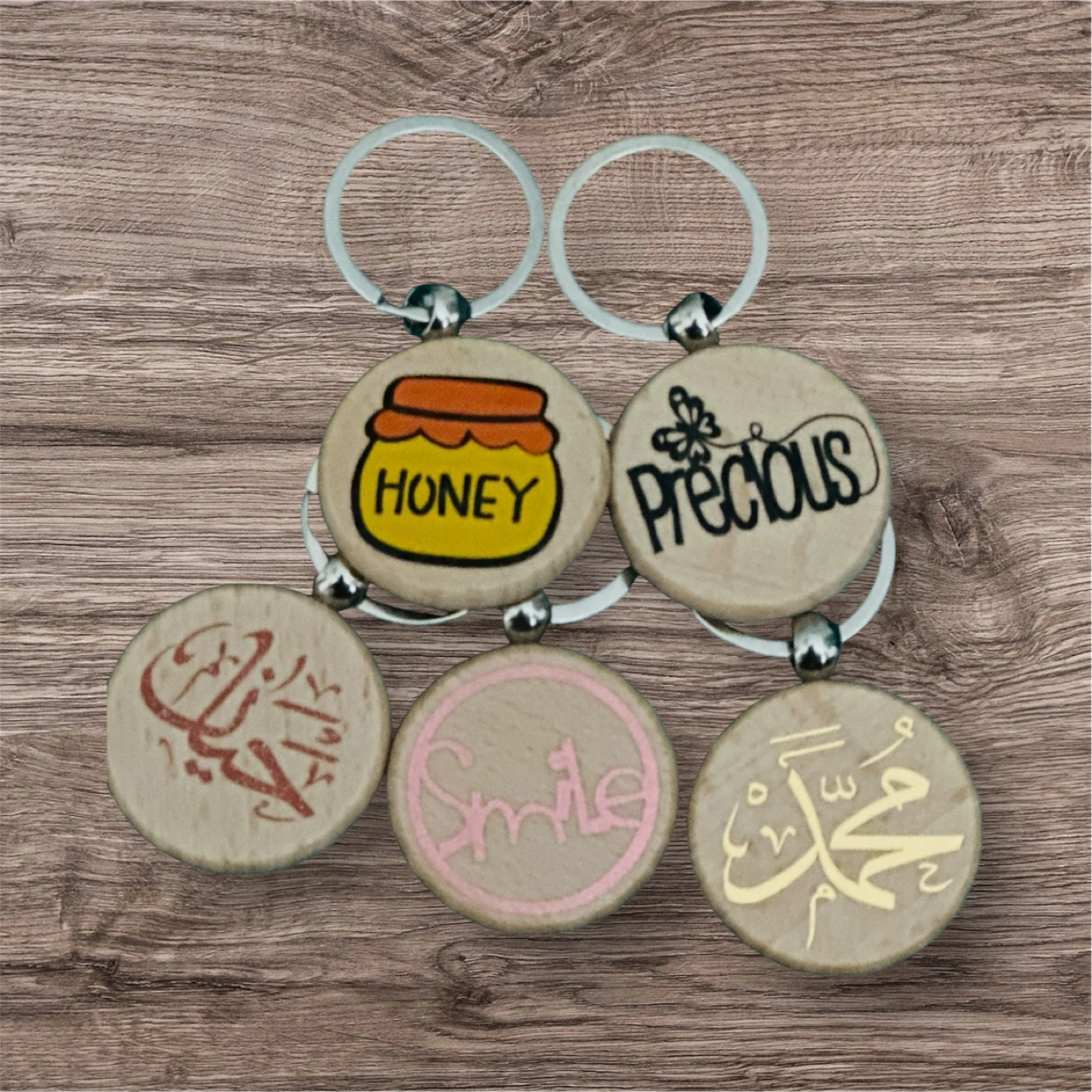 Double-sided cute designs. Wooden circles with metal rings. Perfect for gifts or personal use. Customization is available.