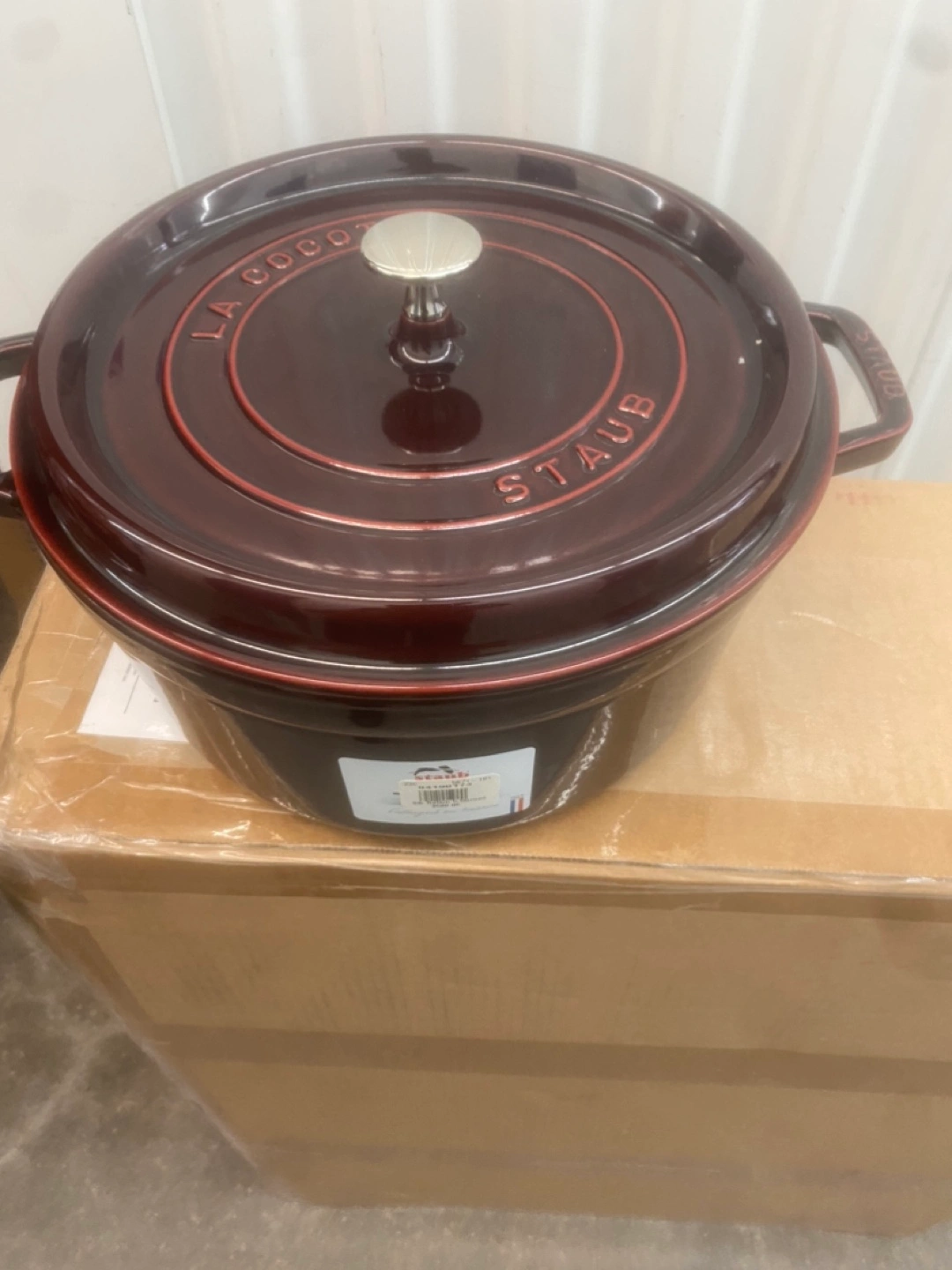 Dark red enamelled cast iron round cocotte. Features a knobbed lid and two handles. Excellent for stovetop and oven use.
