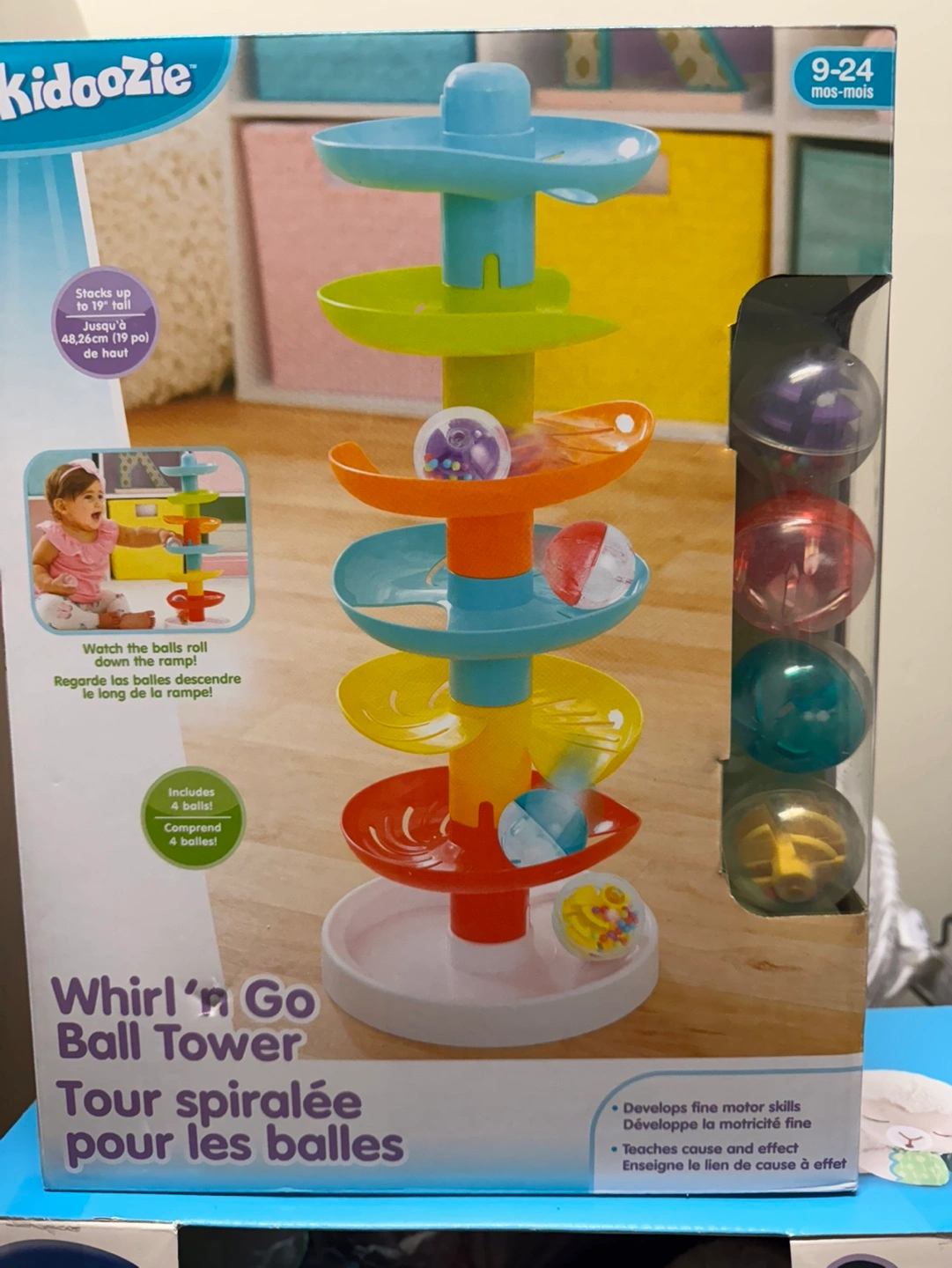Ball tower toy. Stacks up to 19" tall. Includes 4 balls. Develops fine motor skills. Teaches cause and effect.