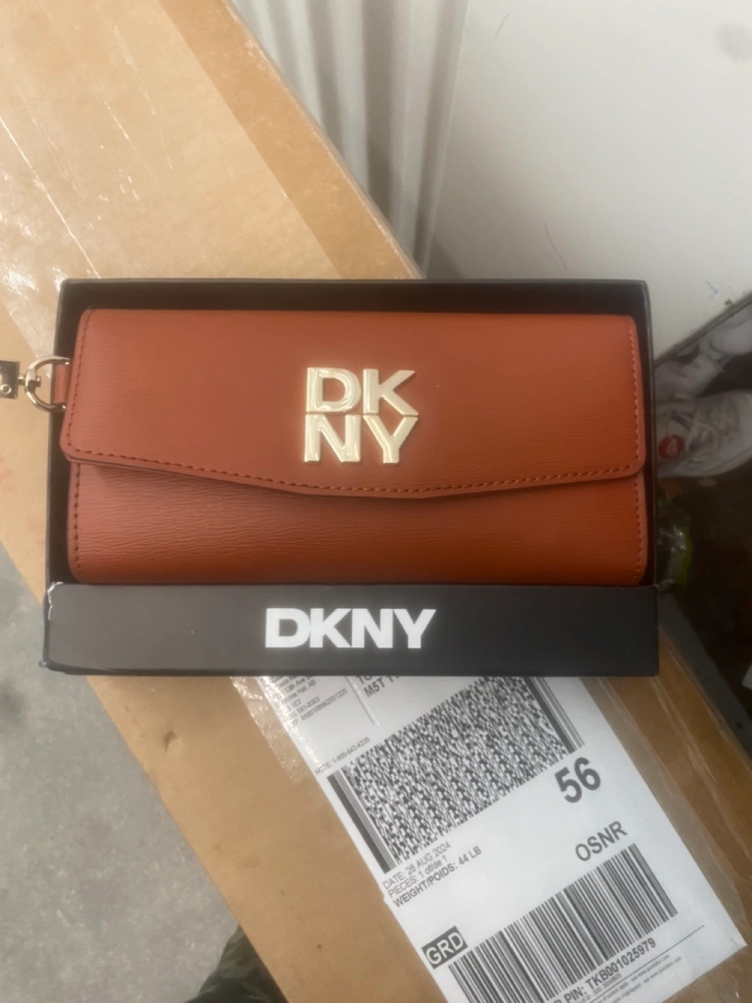 New DKNY wallet, brown leather. Features the DKNY logo. Compact size, wristlet strap.