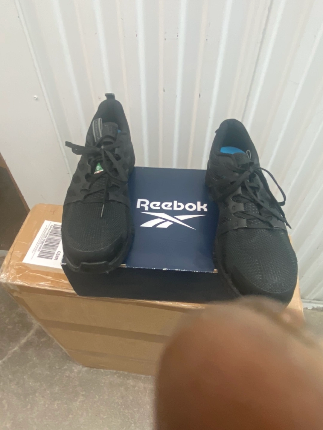 Pair of black men's running shoes. Appear to be new. Reebok logo on box.