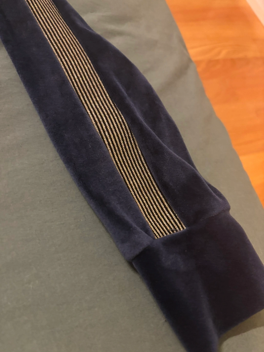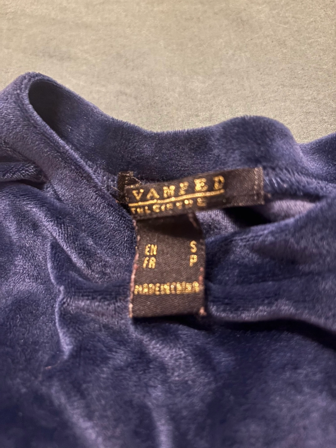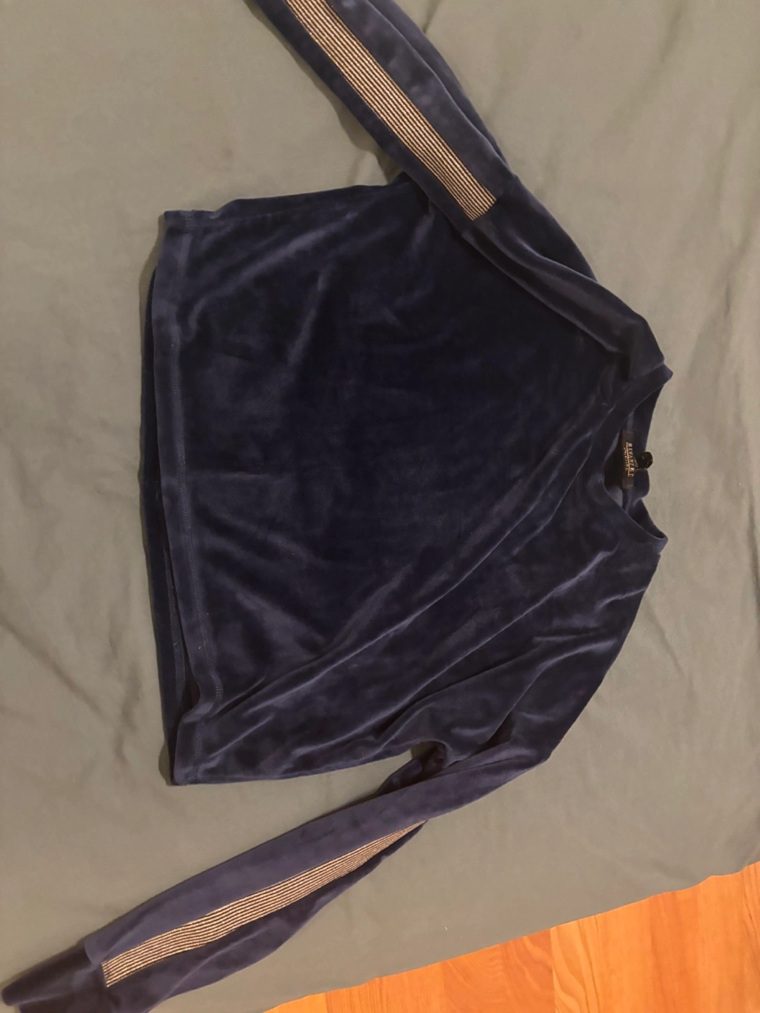 Navy blue velour cropped long-sleeve top. Features gold and black striped detailing on the sleeves. Size small.