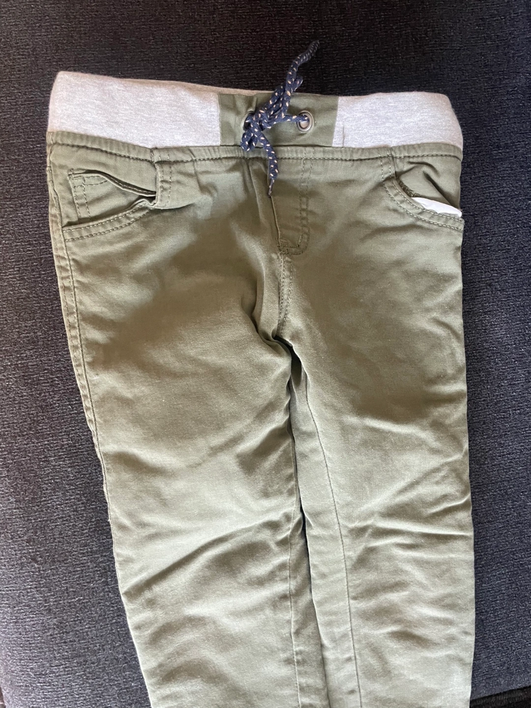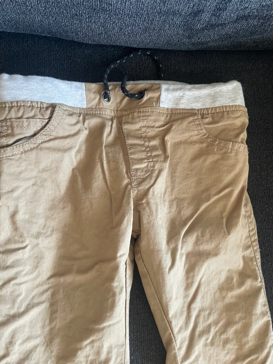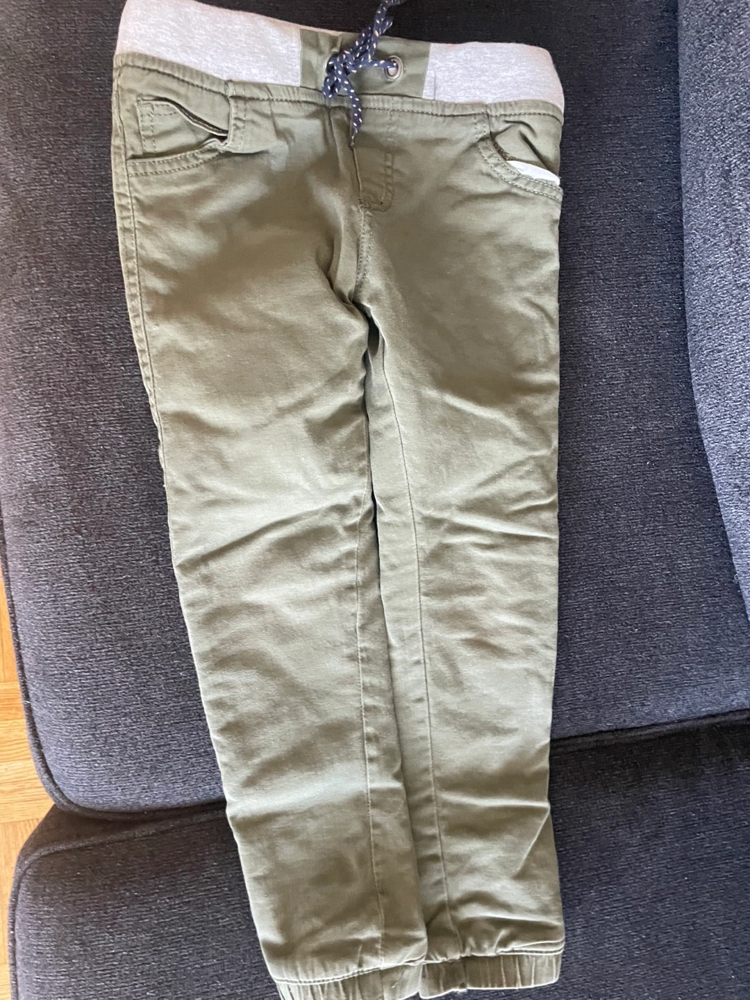 Four pairs of boys' pants. One pair light blue denim-style joggers with various design details. One pair grey and black joggers with side panels. One pair khaki pull-on pants . Excellent used condition. Perfect for active play. In very good condition