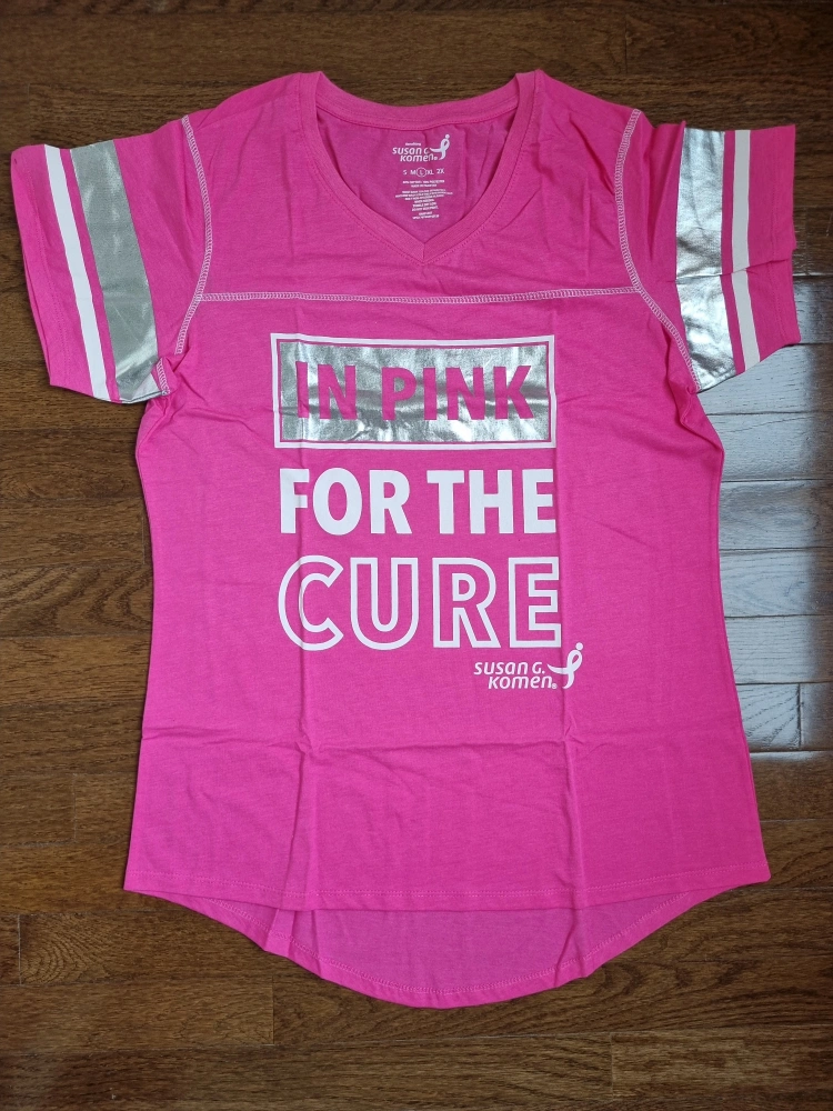 Pink V-neck T-shirt. Features silver accents on the sleeves. Says 'In Pink For The Cure'. Never worn! Pls bring your own bag to carry it. Bonus! Willing to give the Jade Roller or Etihad Amenities Kit on my page for FREE when u purchase this π