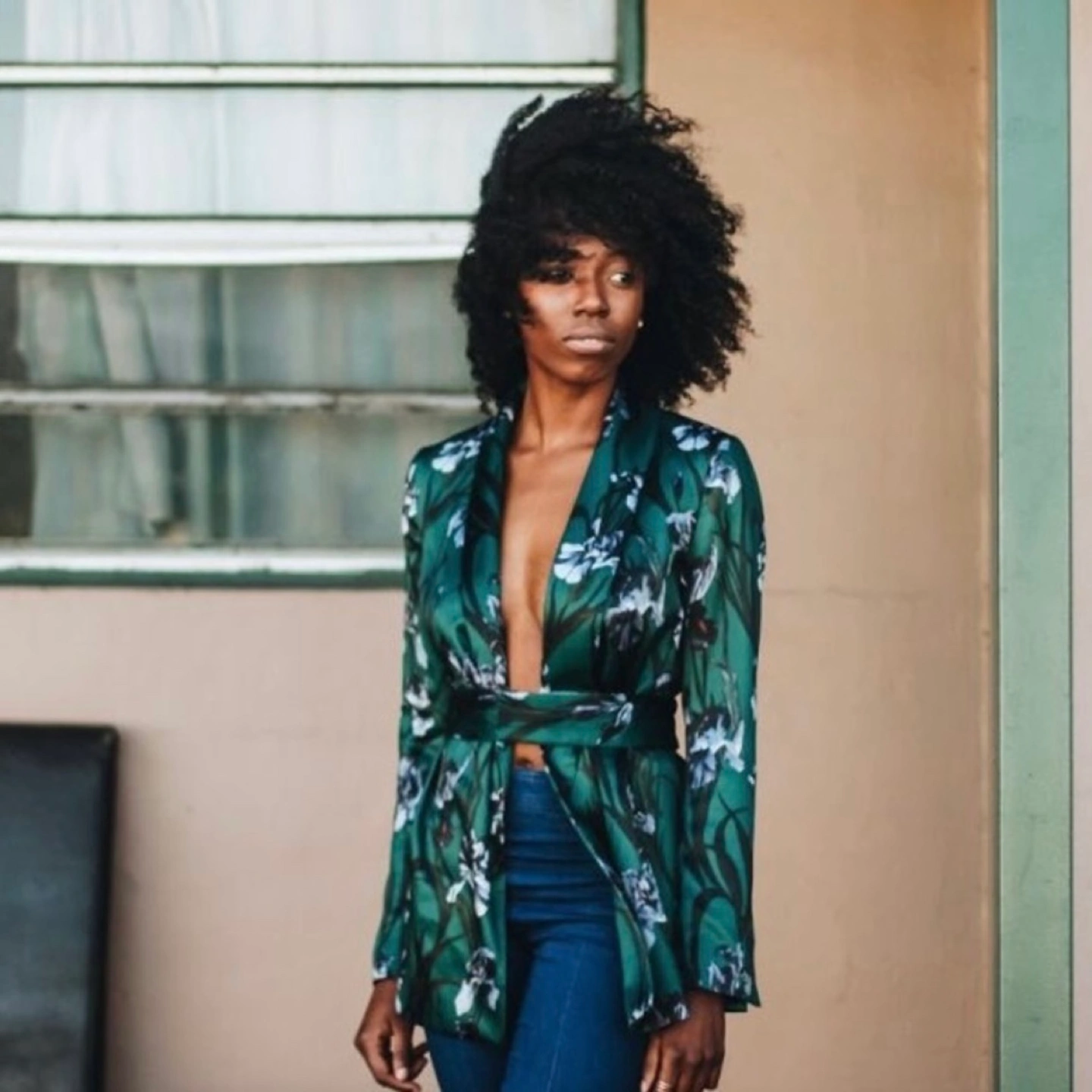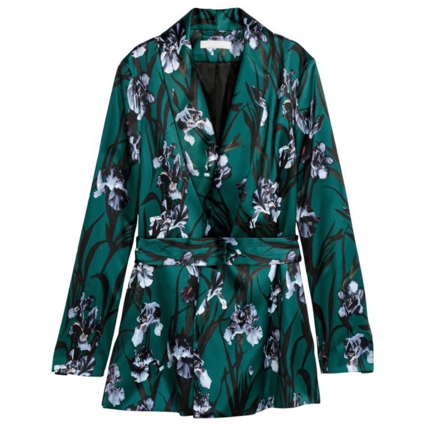 H&M Jacket in satin with a printed pattern. Lapels, long sleeves, slits at sides, and no buttons. Soft, removable belt with elastic at back and snap fasteners. Lined. Size 4 Materials: Polyester 100% Lining: Polyester 56%, Rayon 44% Original Price $65.00