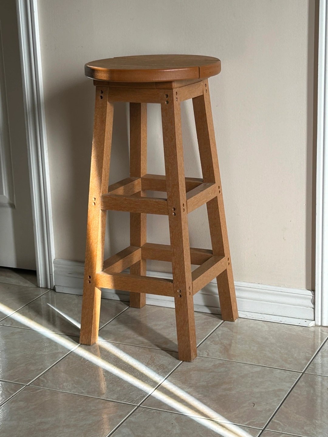 Brown composite bar stool. Simple design. Four legs. Footrest. Round seat. Very heave , stable . Indoor / outdoor . Weather resistant . Perhaps the biggest advantage of composites is their high strength-to-weight ratio. Carbon fiber weighs about 25% as much as steel and 70% as much as aluminum, and is much stronger and stiffer than both materials per weight.