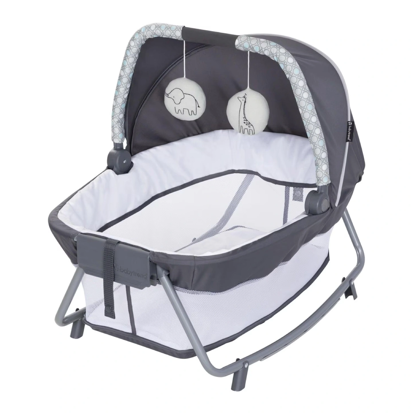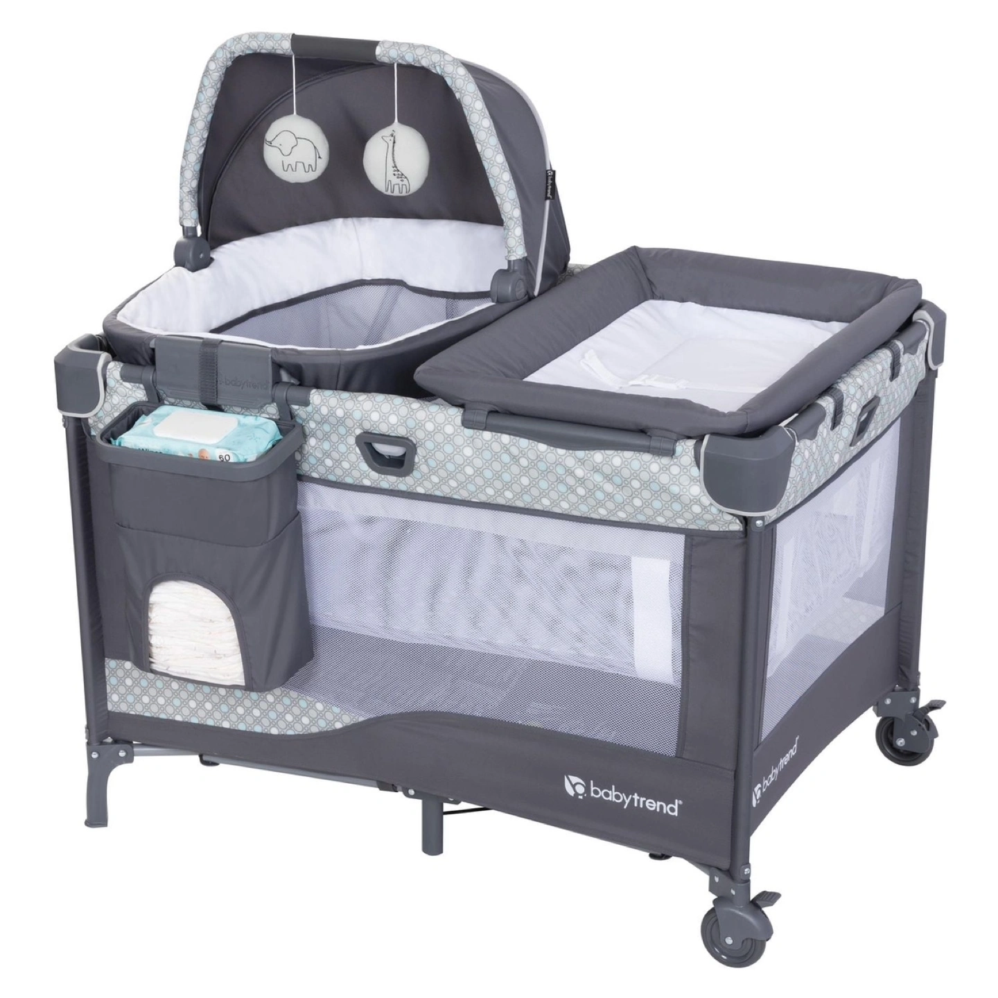 Grey and teal portable playard. Includes bassinet, changing table, and storage. Wheels for easy mobility. Lightweight and foldable for convenient storage. The compact fold easily fits into the included tote bag for easy travel.
