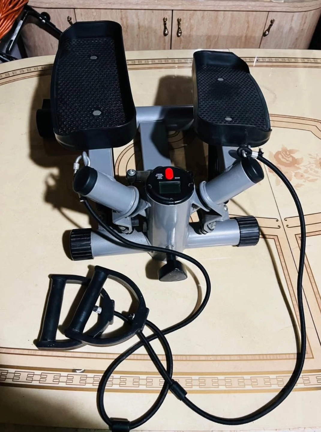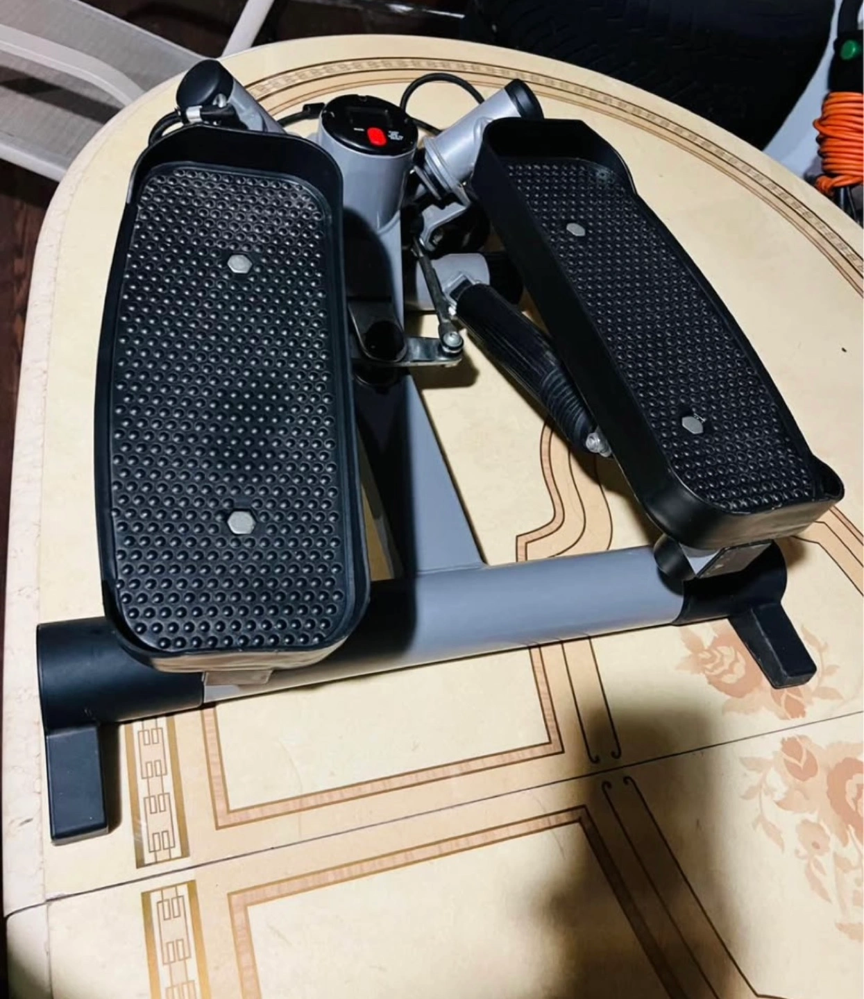 Portable mini stepper. Great for home workouts. Features resistance bands and digital monitor. Compact design for easy storage.