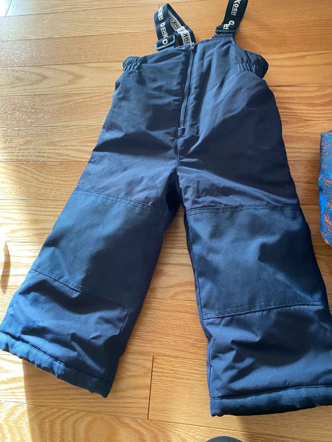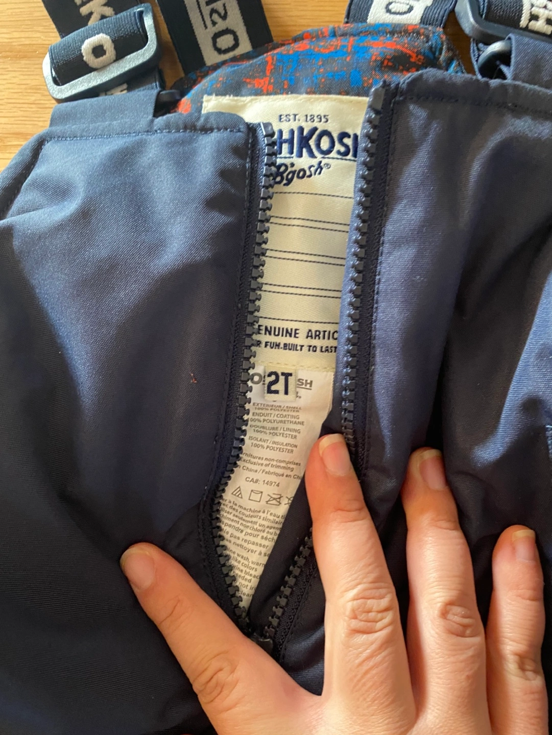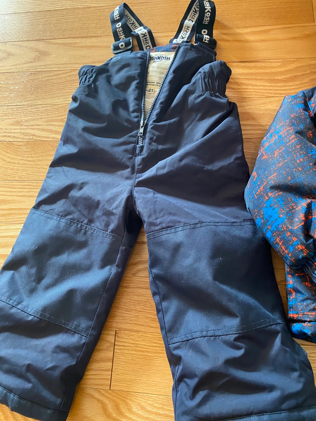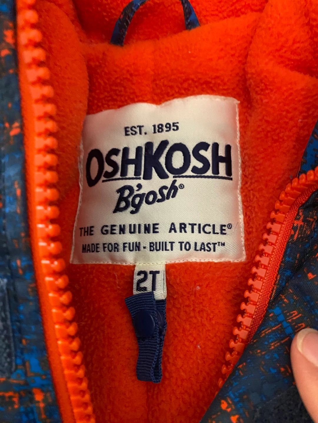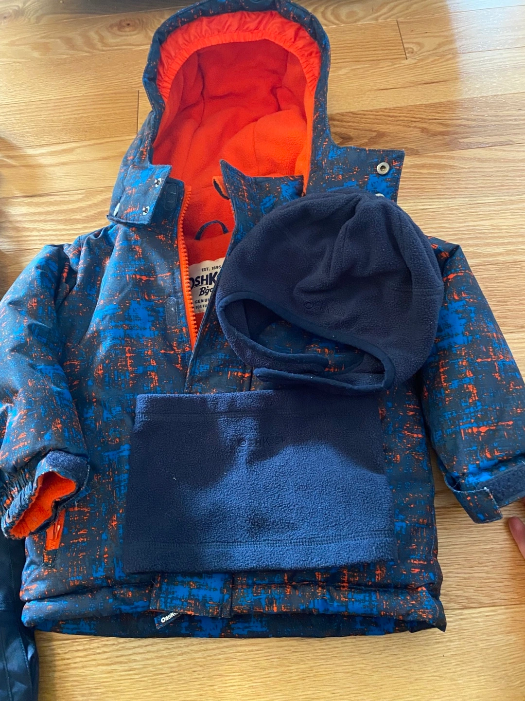 Adorable OshKosh B'gosh snowsuit. Size 2T. Includes jacket, bib overalls, hat, and neck gaiter. Blue and orange colours. Waterproof and warm. Great for winter fun.