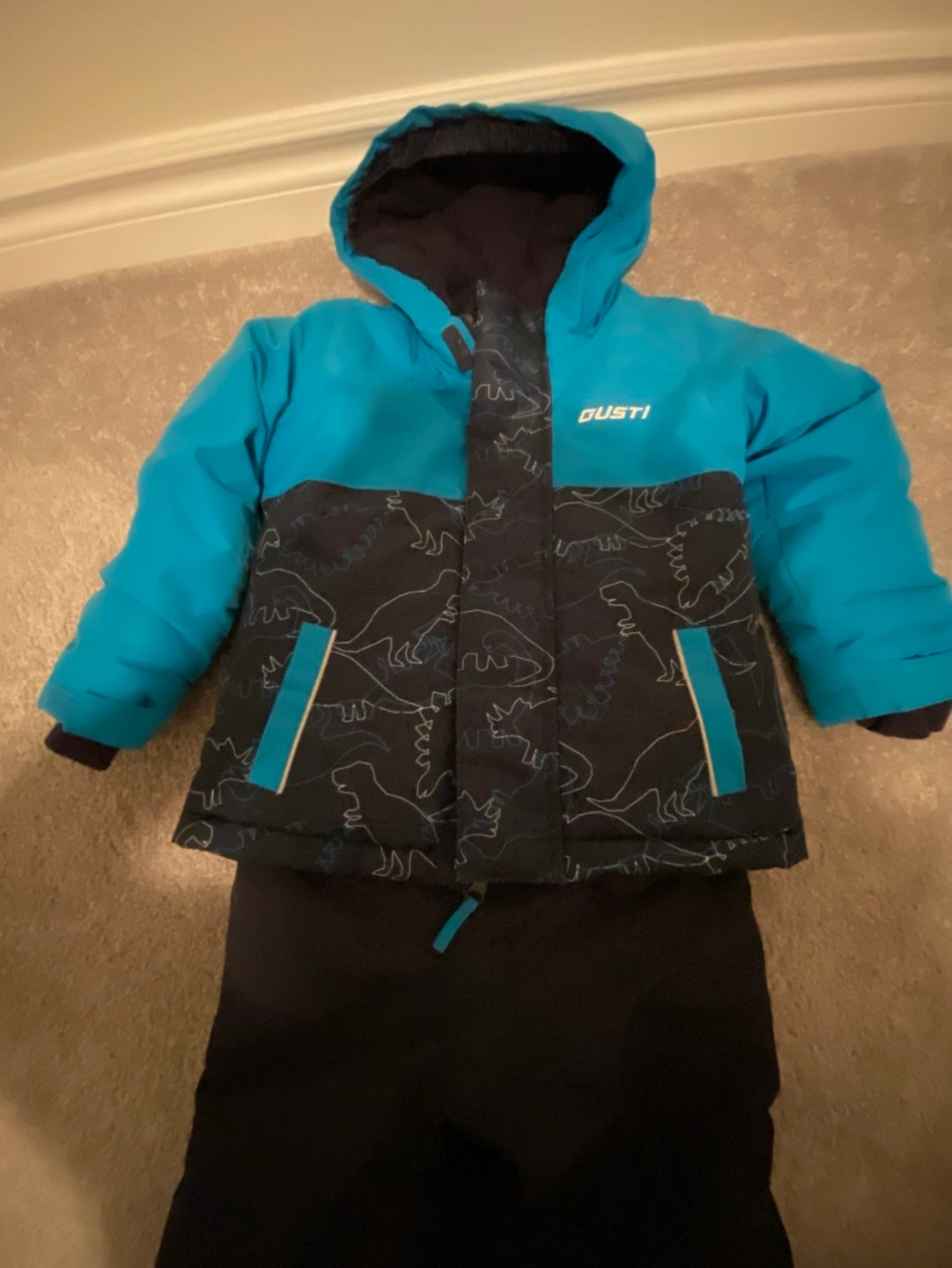 Gusti brand snowsuit, size 2T. Blue jacket with dinosaur print. Excellent condition.
