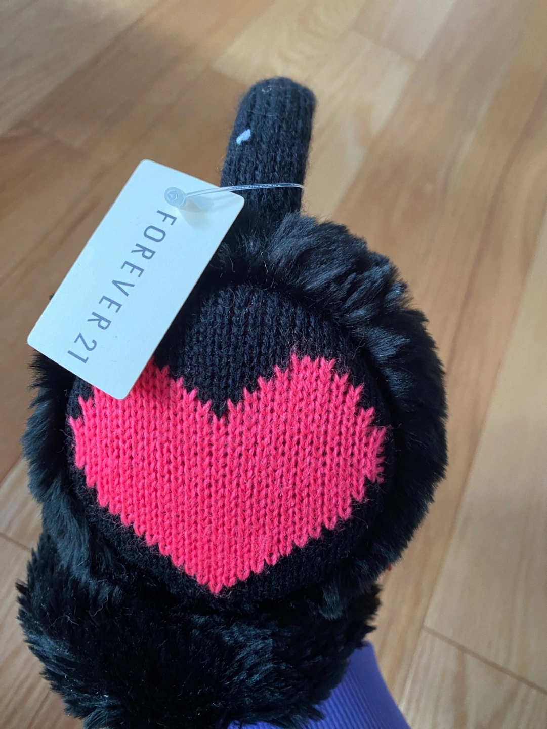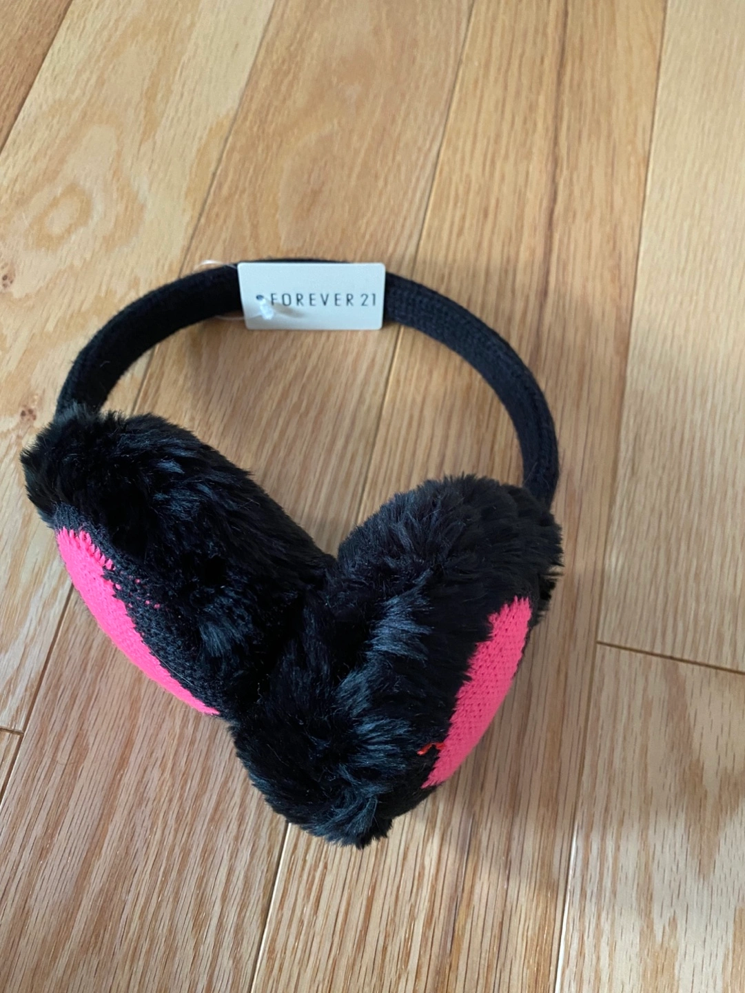 Black earmuffs with pink heart detail. Soft and fuzzy. Perfect for winter. New with tags.