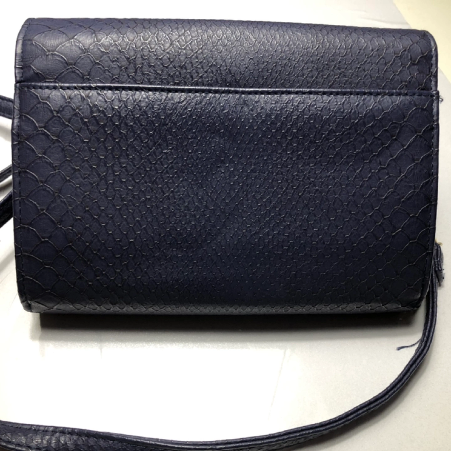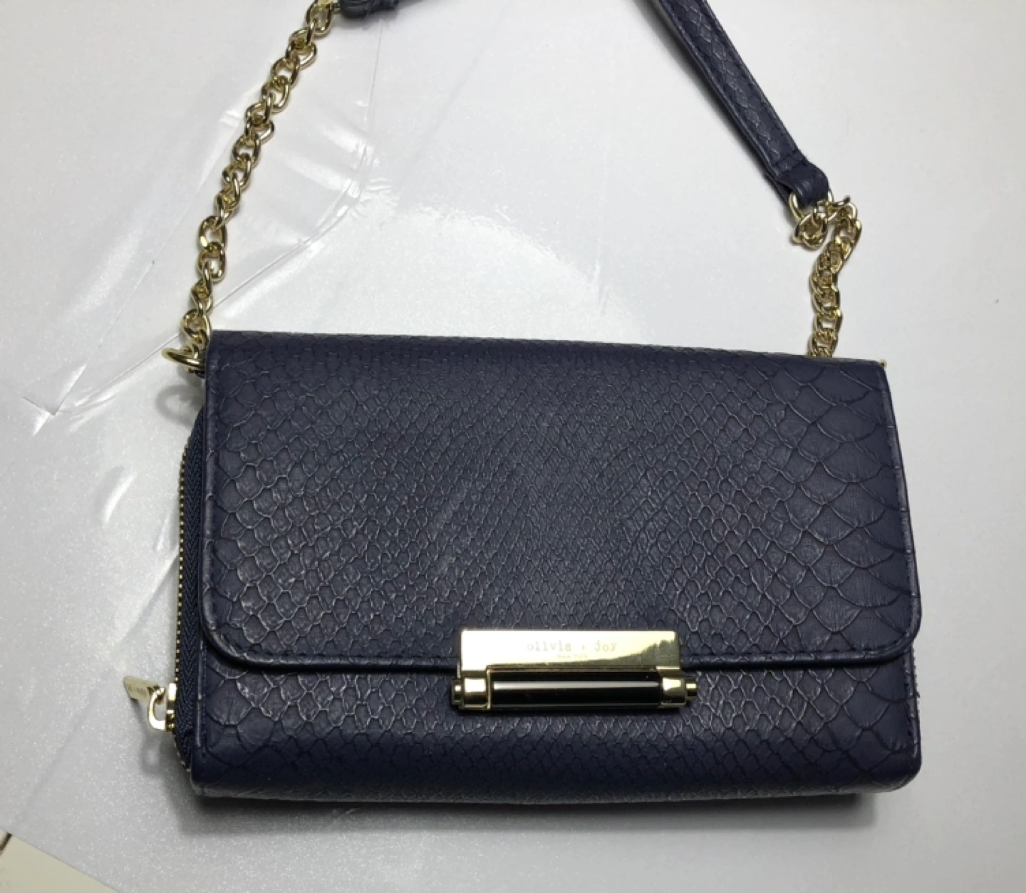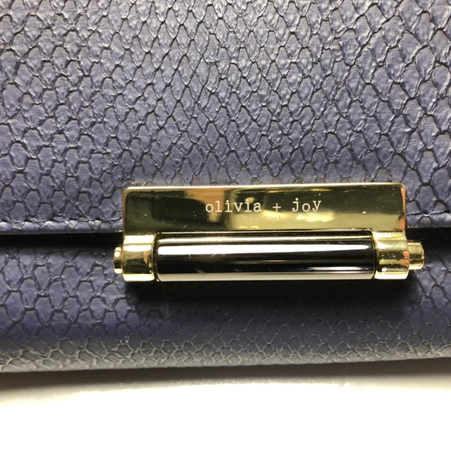 Dark blue snakeskin-textured wallet/clutch on chain. Features a gold-toned chain strap and hardware. Zip closure. Interior lining features the Olivia + Joy logo.