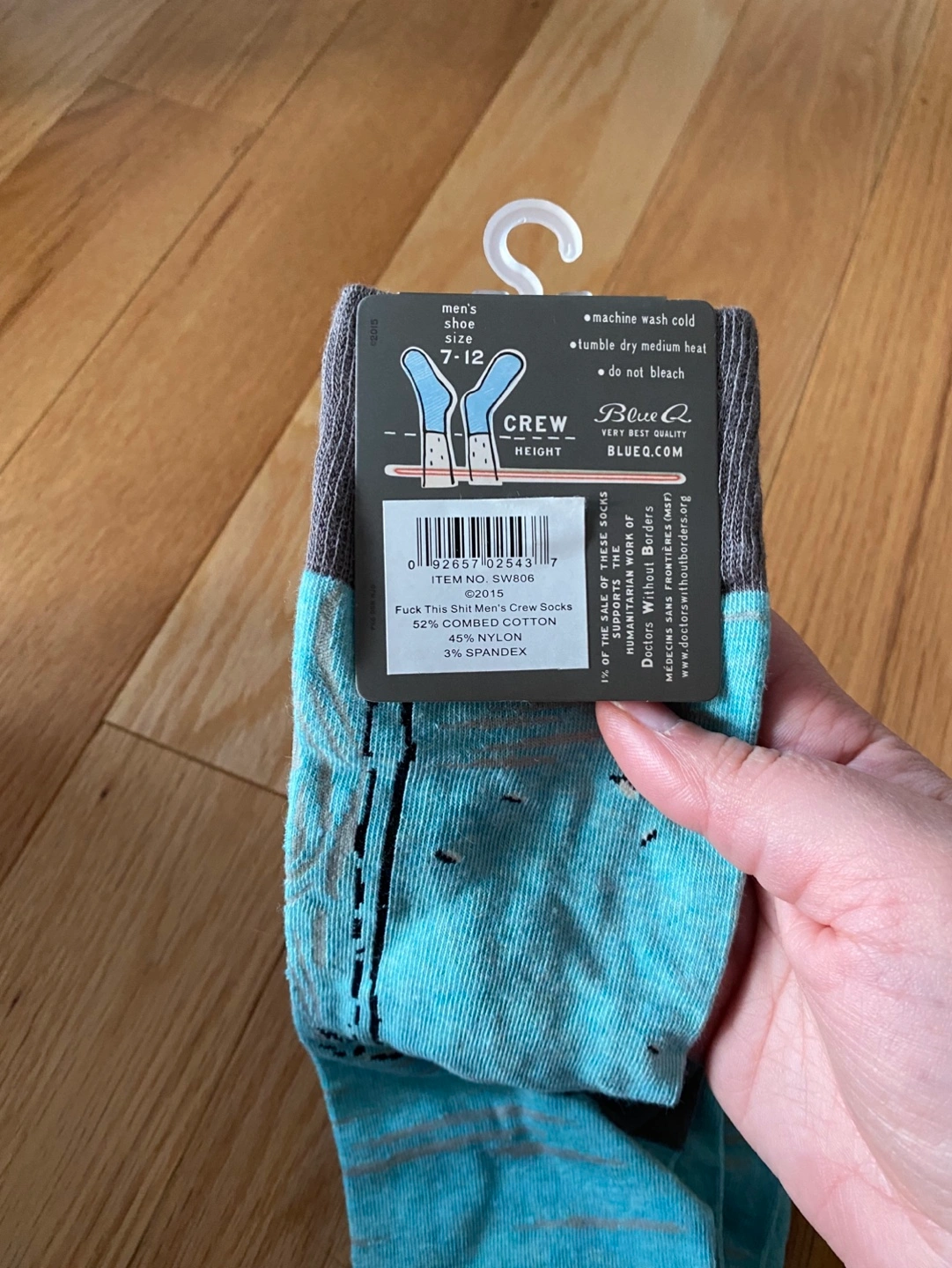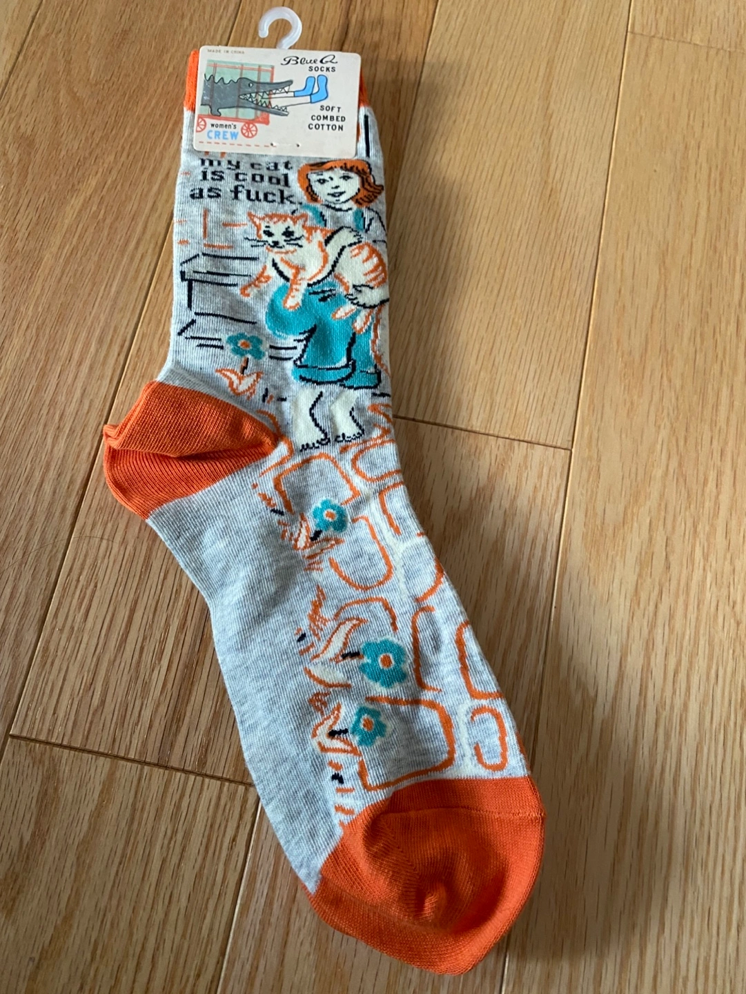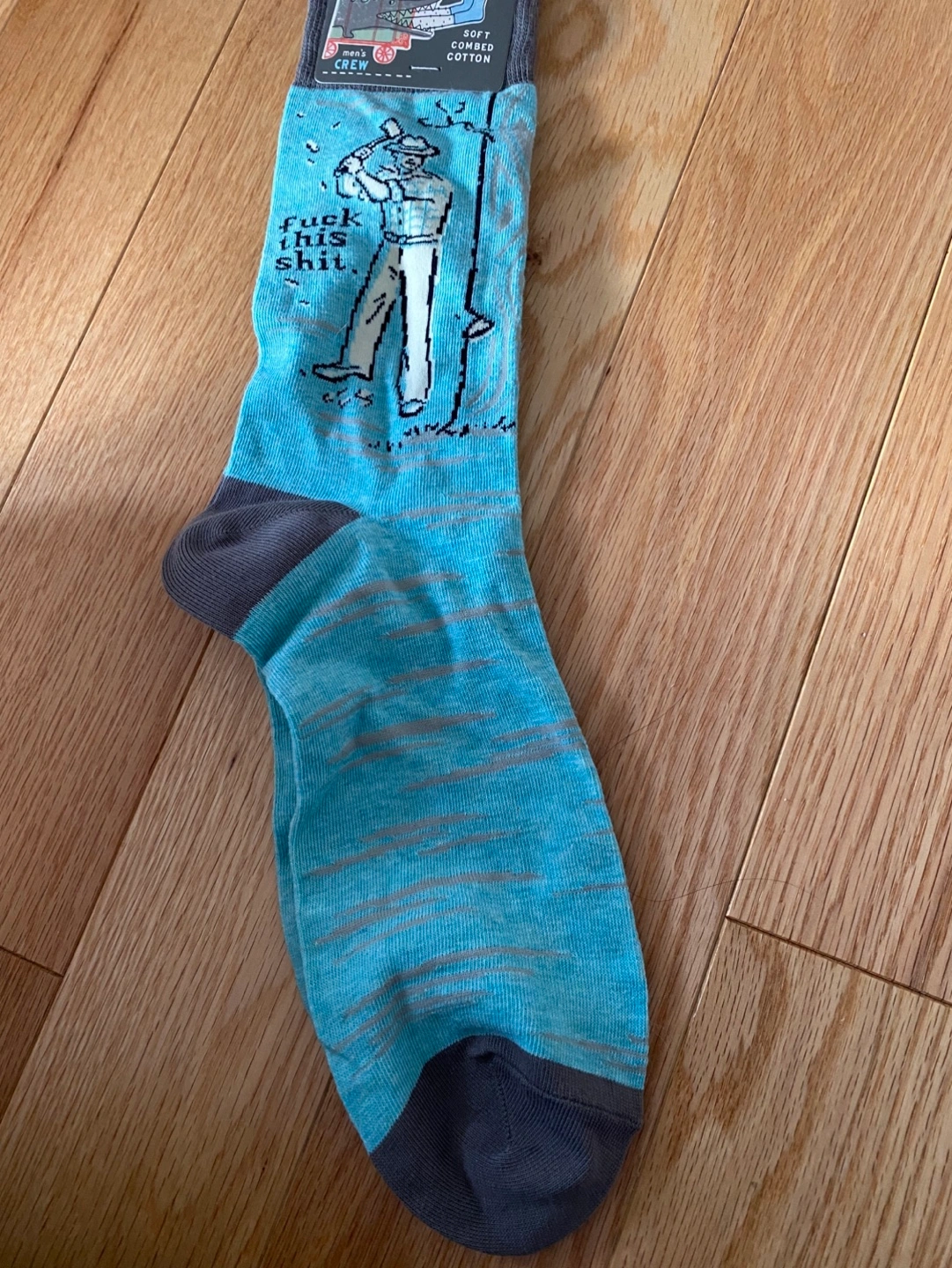 Pair of Blue Q crew socks. Women's size 5-10 and men's size 7-12 available. Features funny sayings and images. Soft combed cotton blend. Machine wash cold. Take both for $10 OBO.