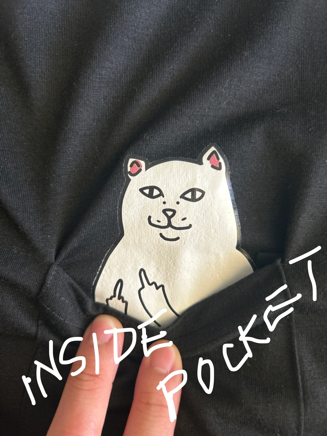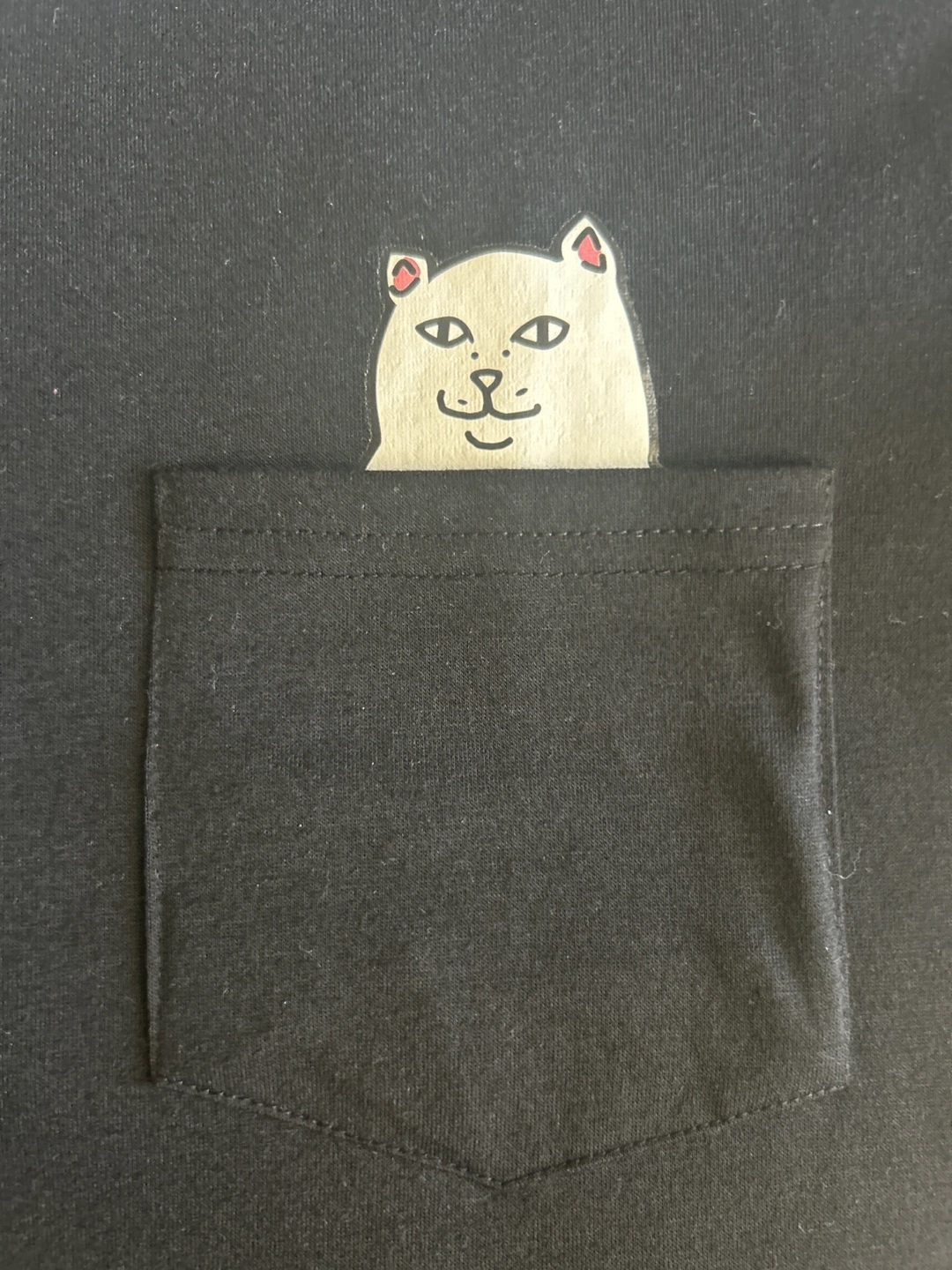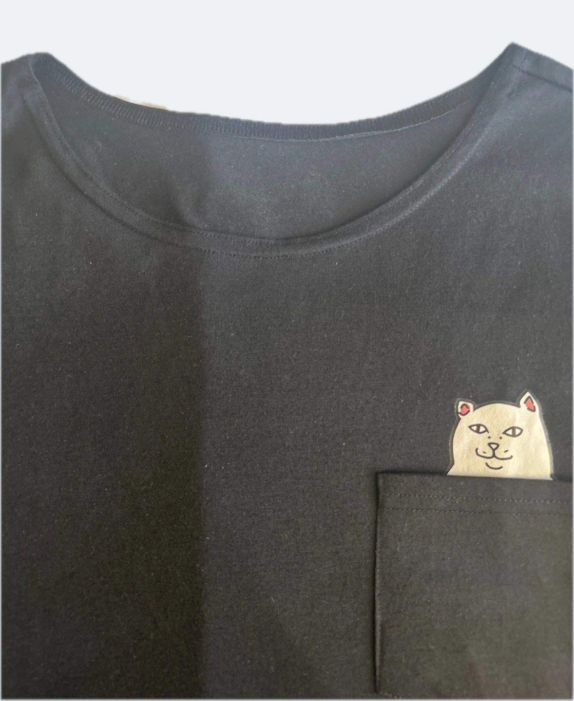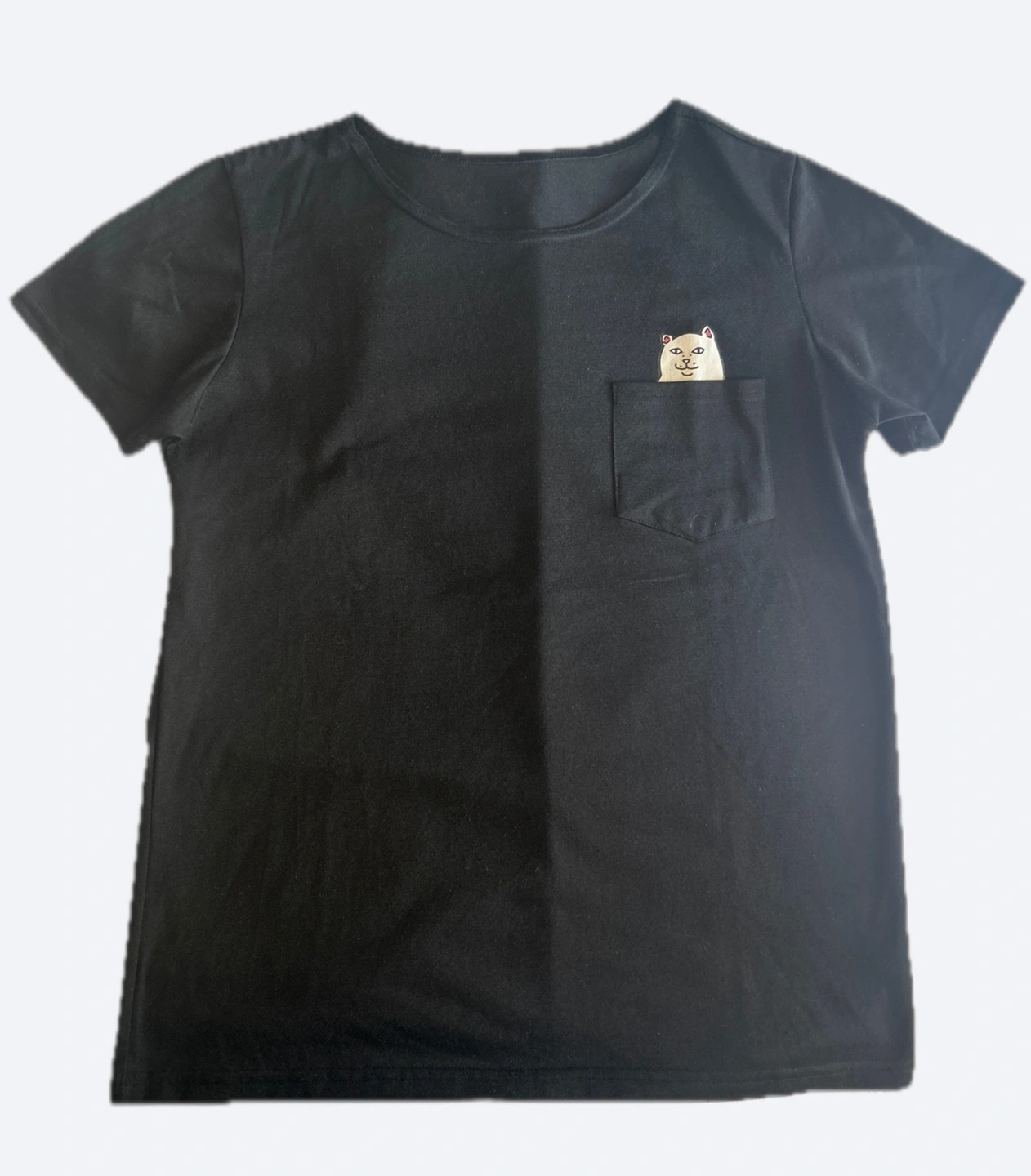 Women's black short sleeve t-shirt. Features a small pocket on the chest with a cat graphic. Sorry for the graphic, no offence intended. It can only be seen if you pull the pocket down. Relaxed fit. No label and no tags. Smoke/Pet free home. Cash and pick up only.