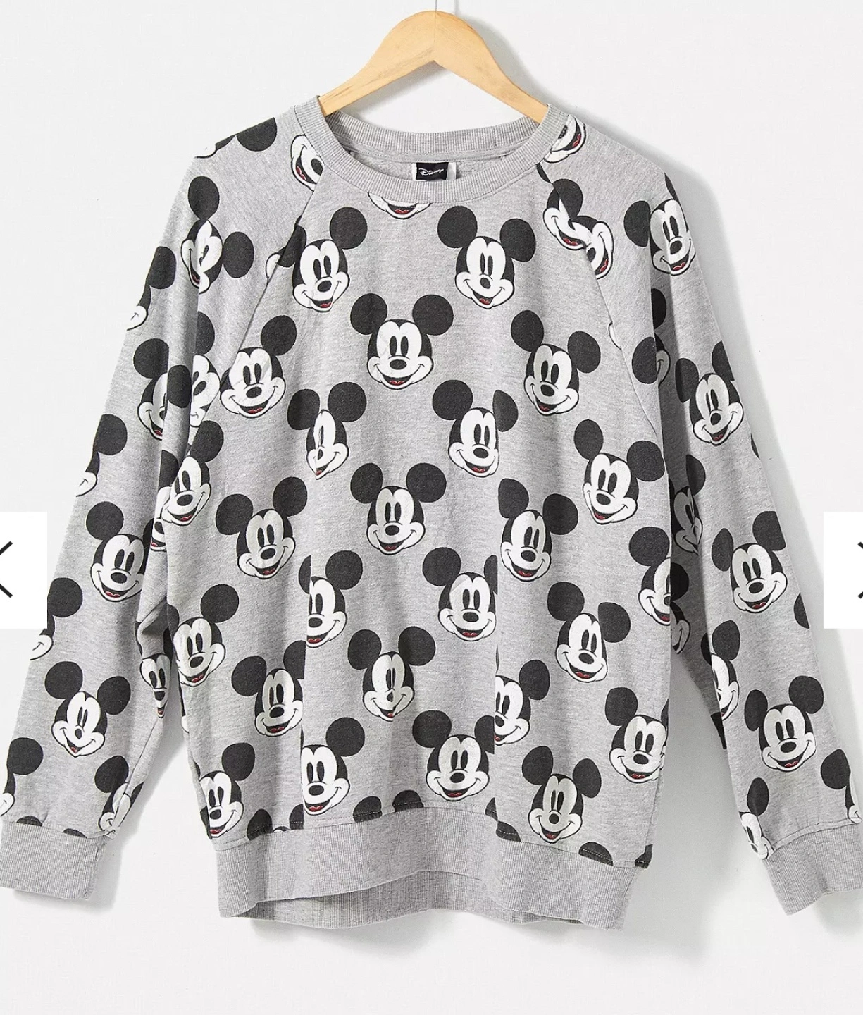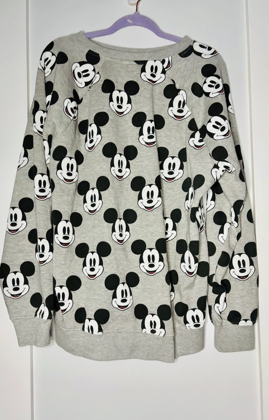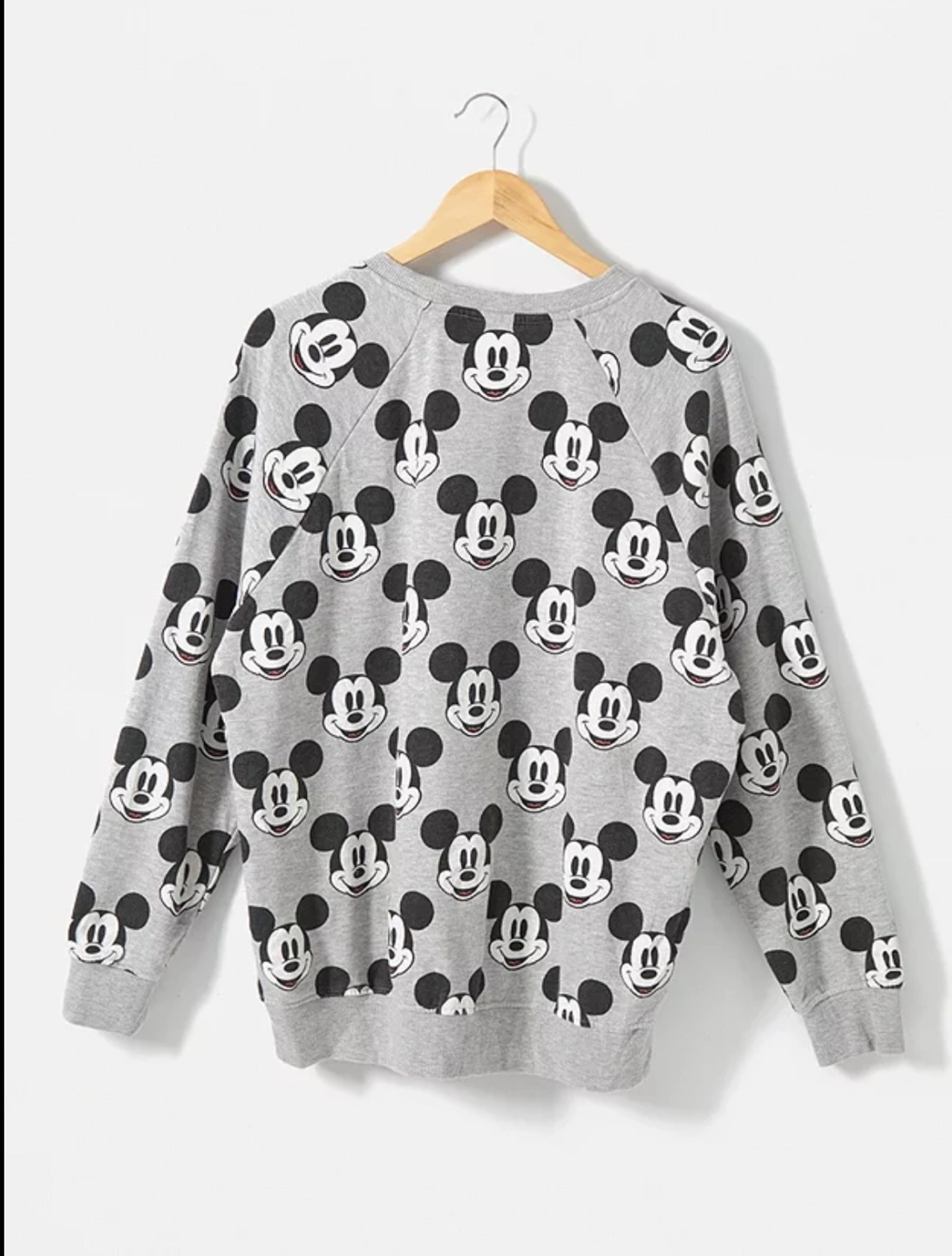 Grey sweatshirt. Features an all-over Mickey Mouse print. Long sleeves. Crew neck. Relaxed fit. Retails $85