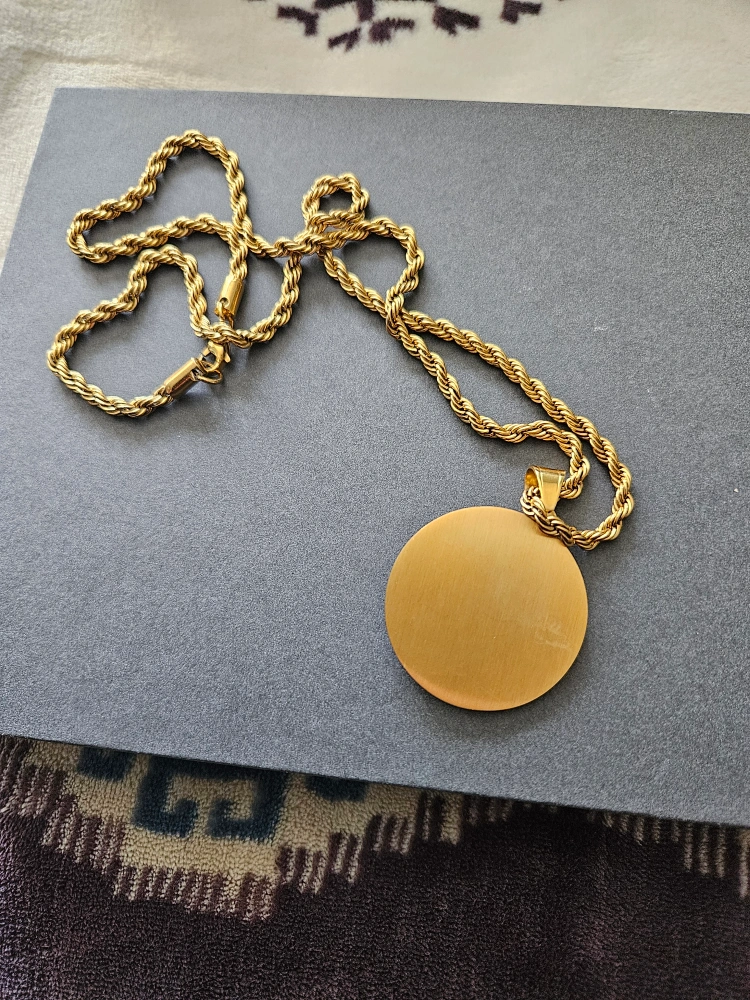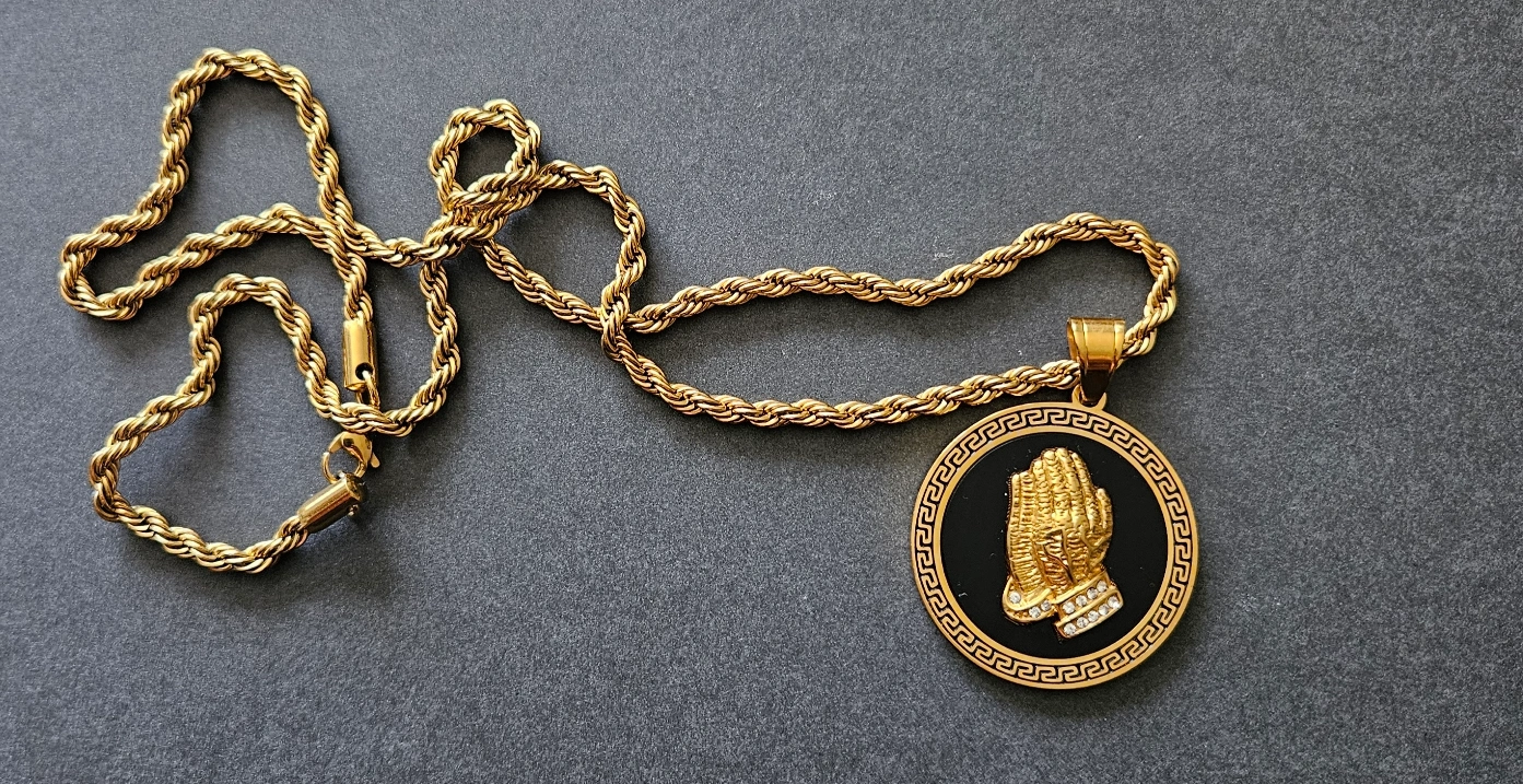 Gold steel rope chain necklace. Round pendant features praying hands. Black background. Small clear stones. Clasp closure.