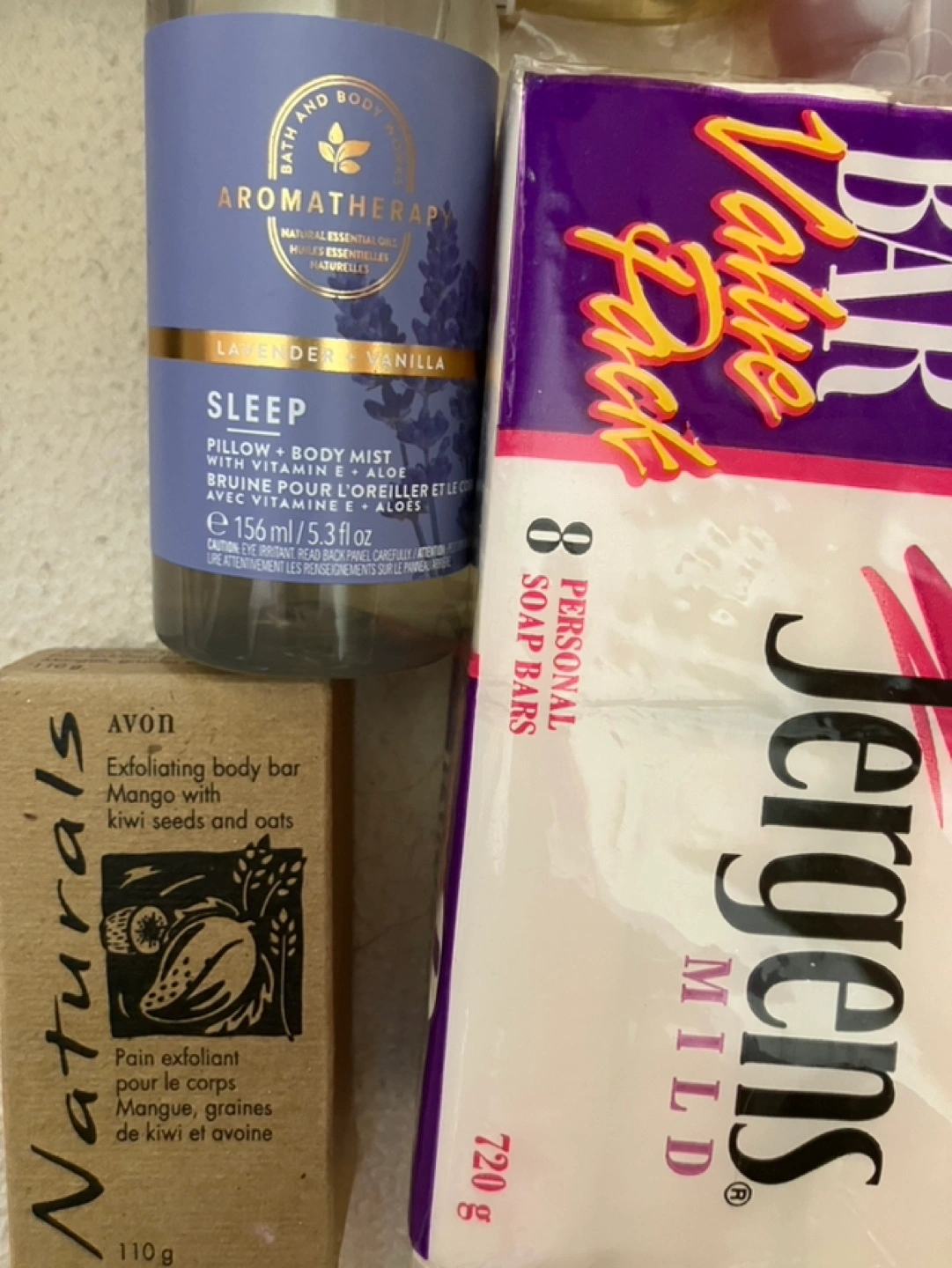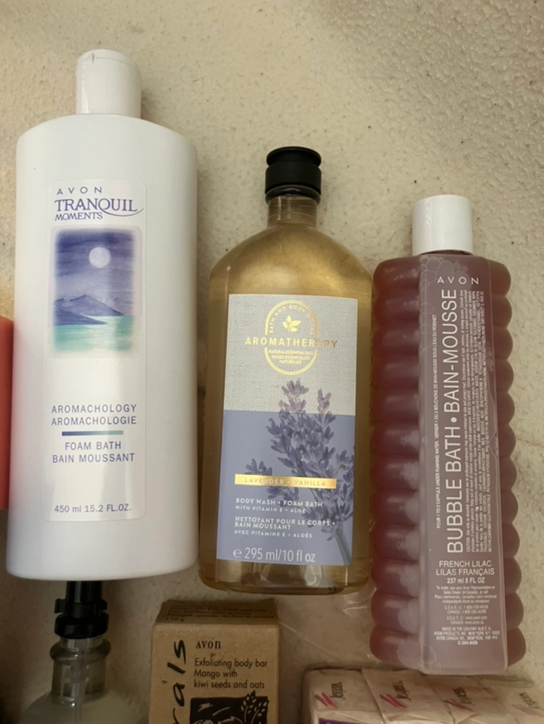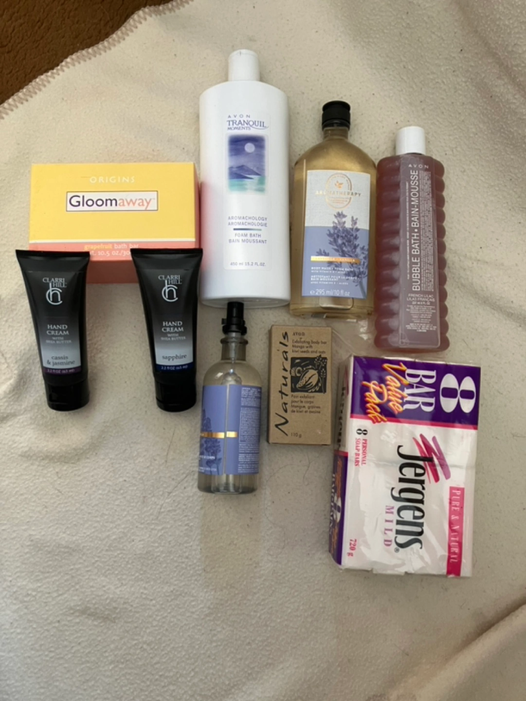 Large collection of bath and body products. Includes Avon Tranquil Moments foam bath, Aromatherapy lavender vanilla body wash and mist, exfoliating body bar, bubble bath, and hand creams. Also includes Origins Gloomaway grapefruit bath bar and Jergens Mild soap. Perfect for gifting or personal use. P/up only-Thornhill-Yonge & Elgin…cash only