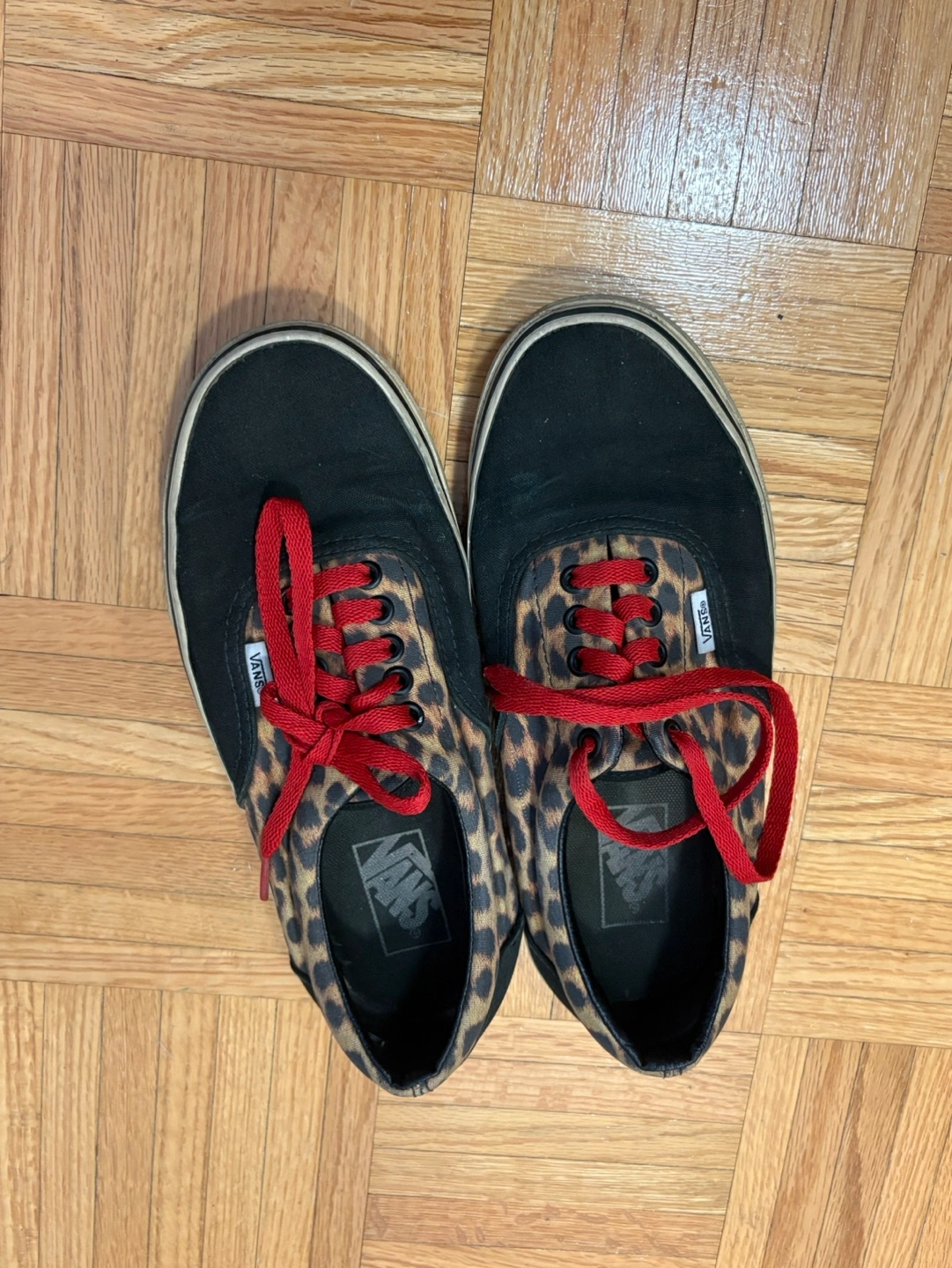 Pre-owned Vans sneakers. Leopard print design. Red laces. Women's size 8, Men's size 6.5.
