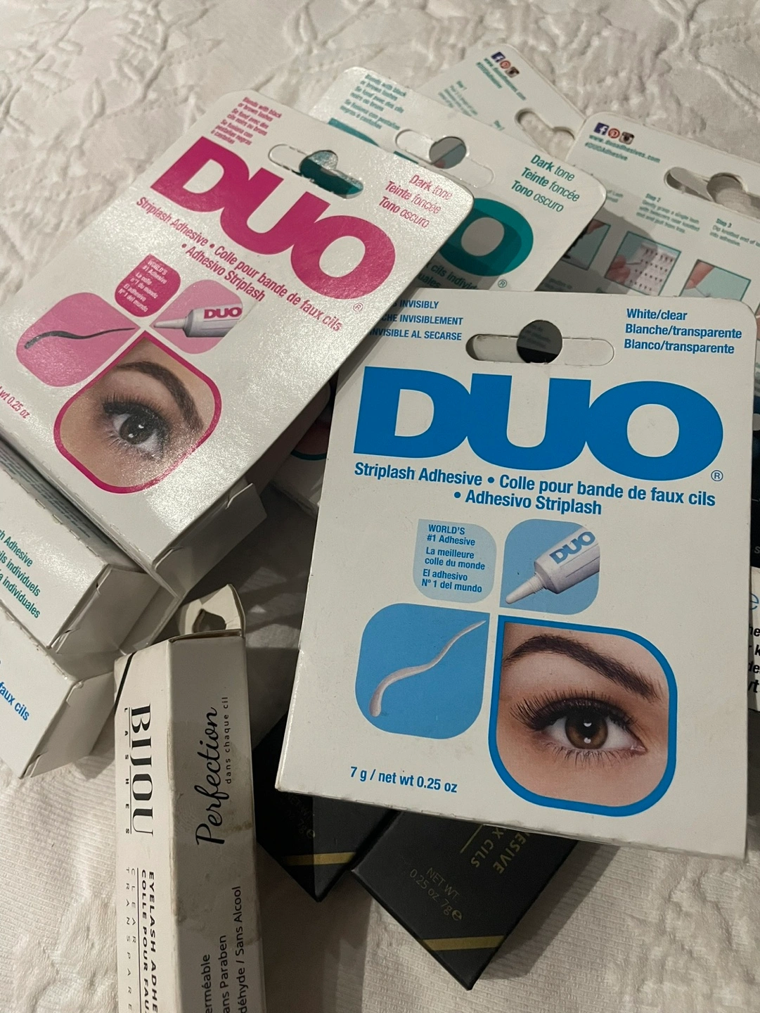 Includes: several Silkline facial cleansing pads in teal and pink, various Duo lash adhesives, multiple pairs of Ardell lashes, and three continuous spray bottles, colour bowls All new