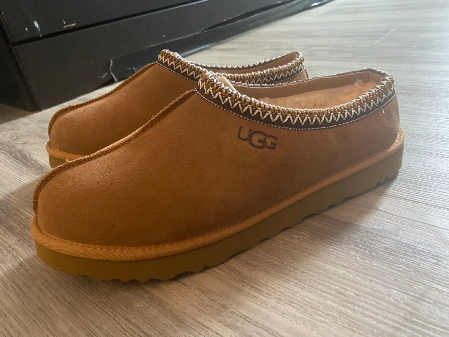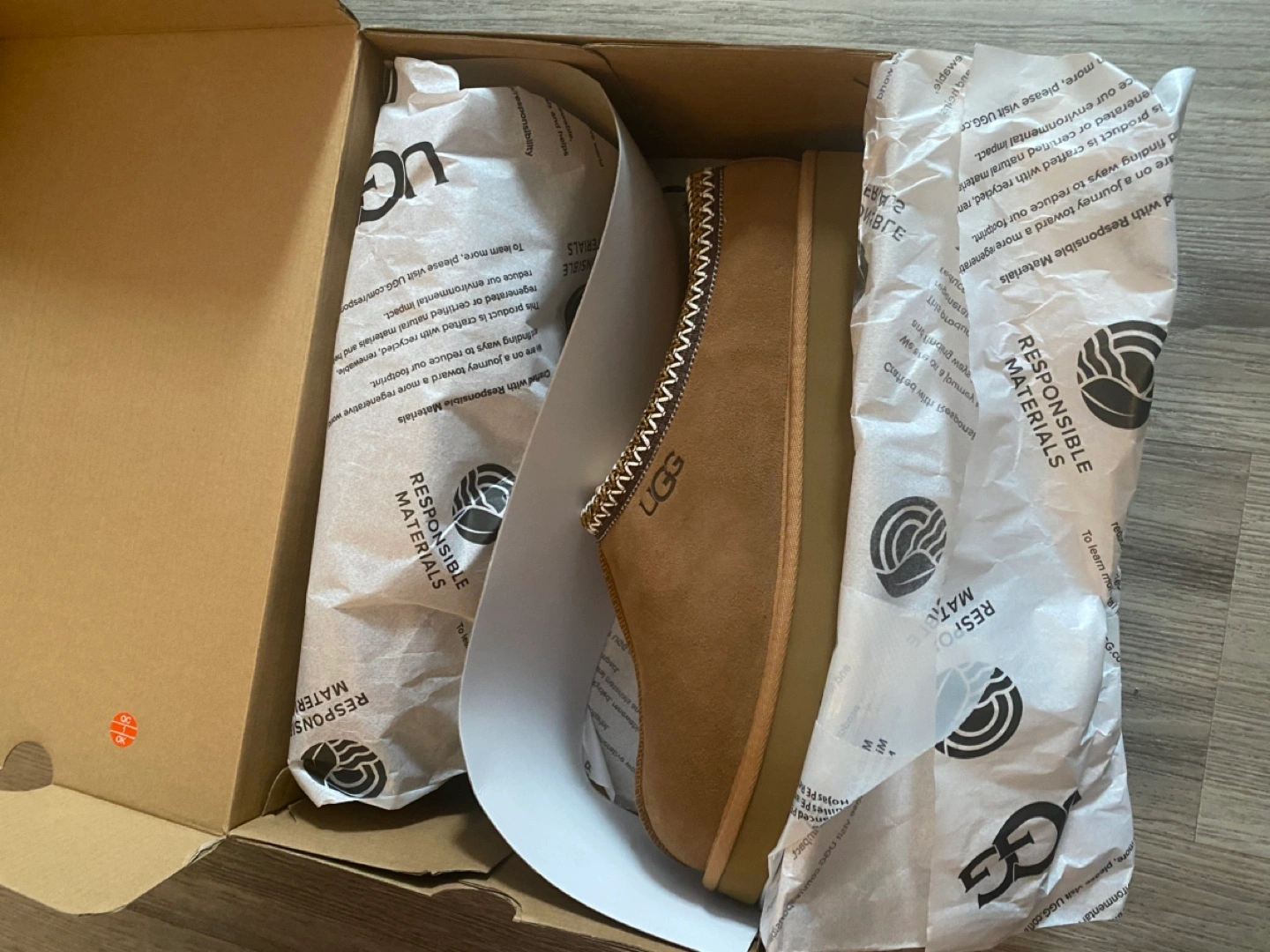 Cozy and comfortable UGG Scuffette II slippers. Brown suede upper. Easy slip-on style. Great for lounging around the house. Comes in original box.