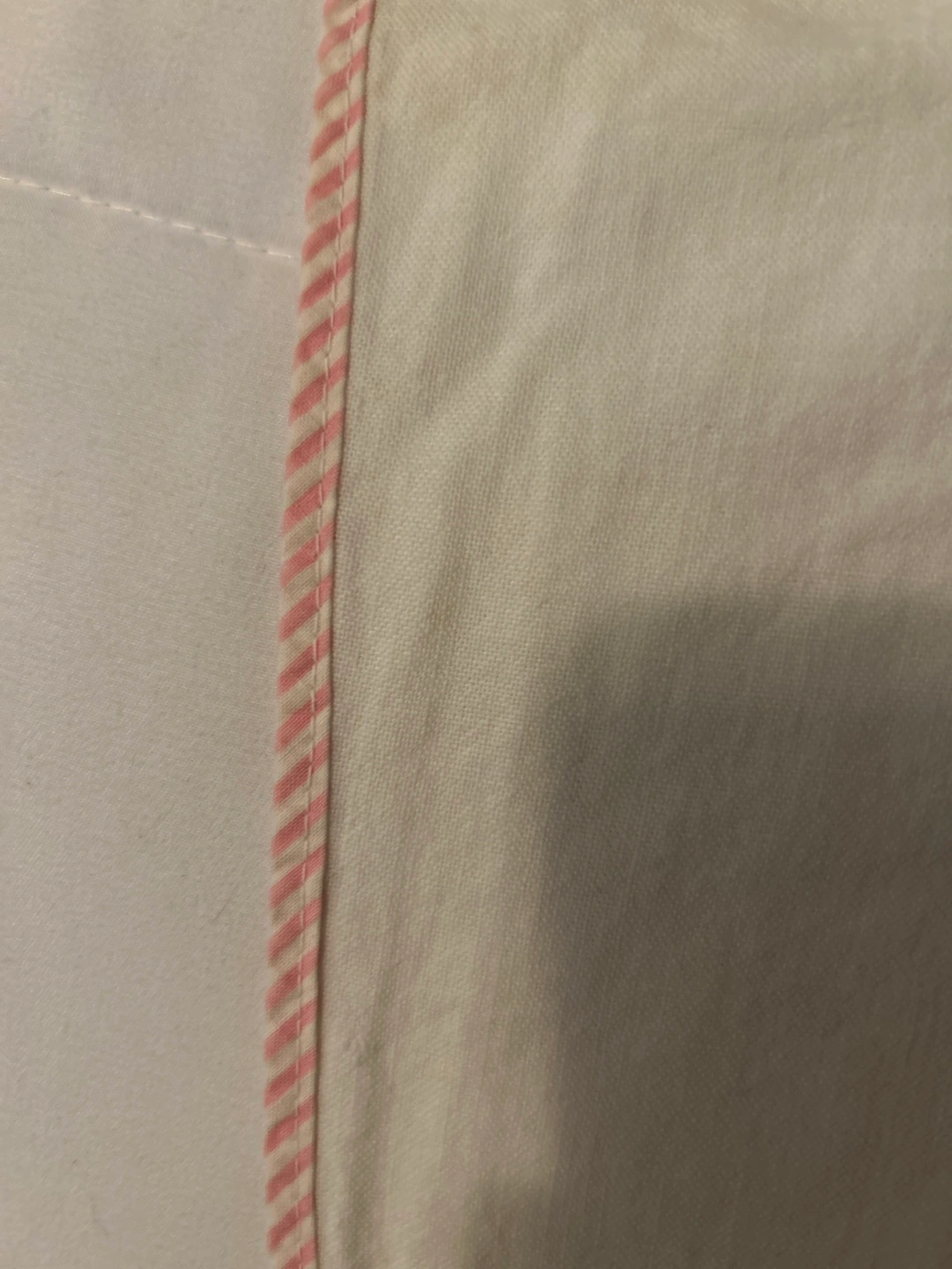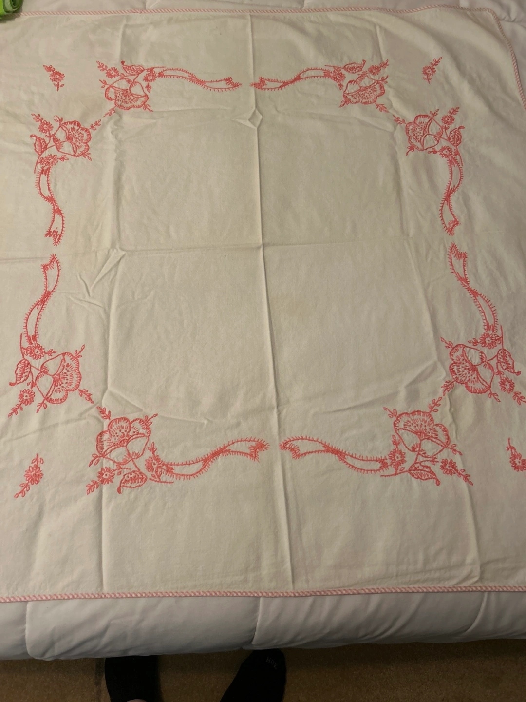 Lovely vintage tablecloth. Features delicate pink floral embroidery. Off-white cotton fabric. Pink and white stitched border. Excellent for adding a touch of vintage charm to your home.